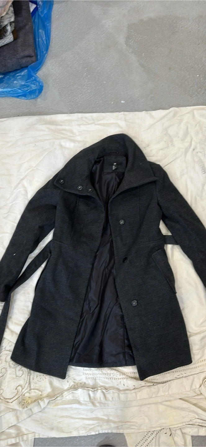 A stylish grey coat! It has a nice collar and a belt to cinch the waist. Perfect for fall weather!