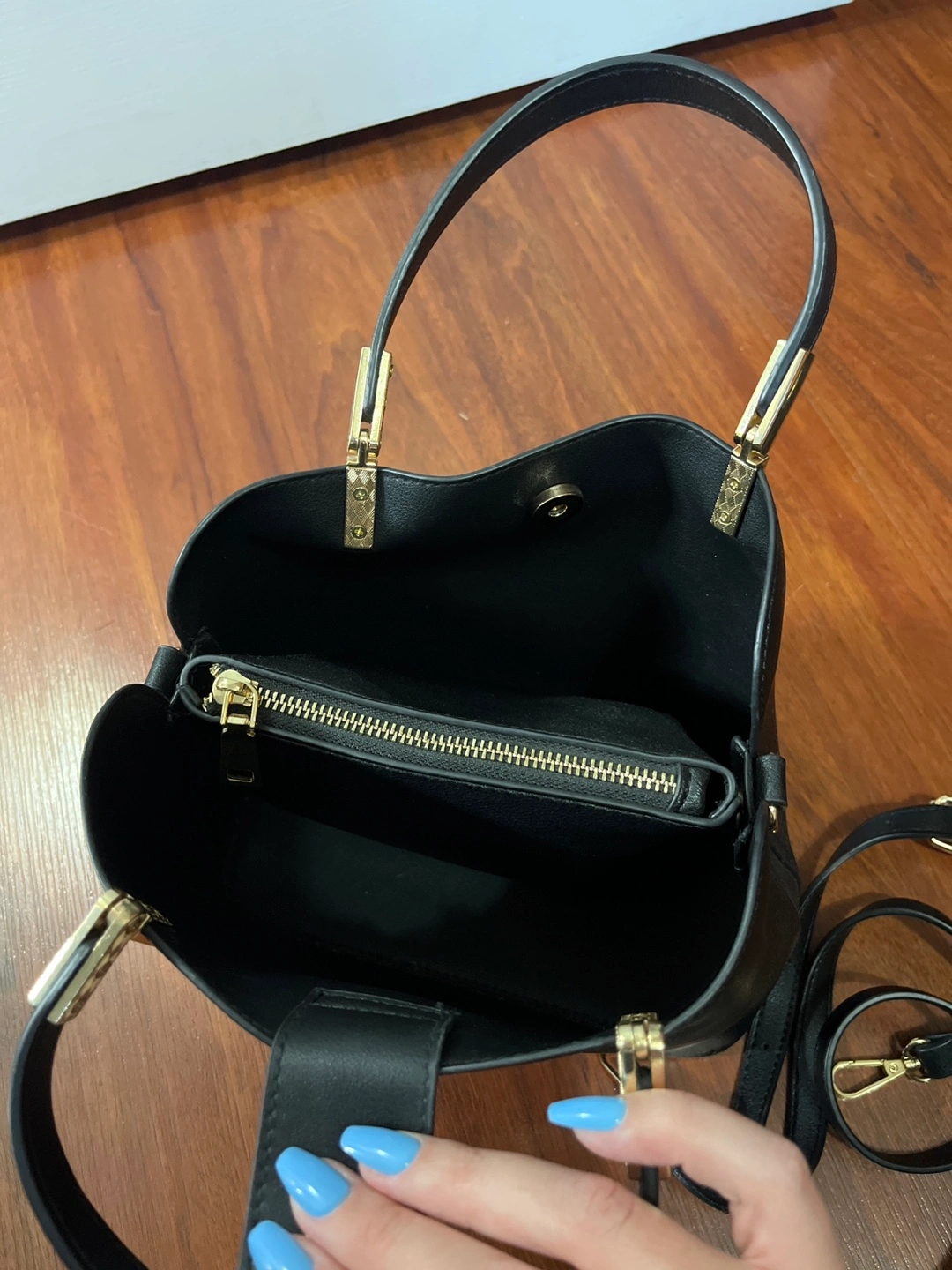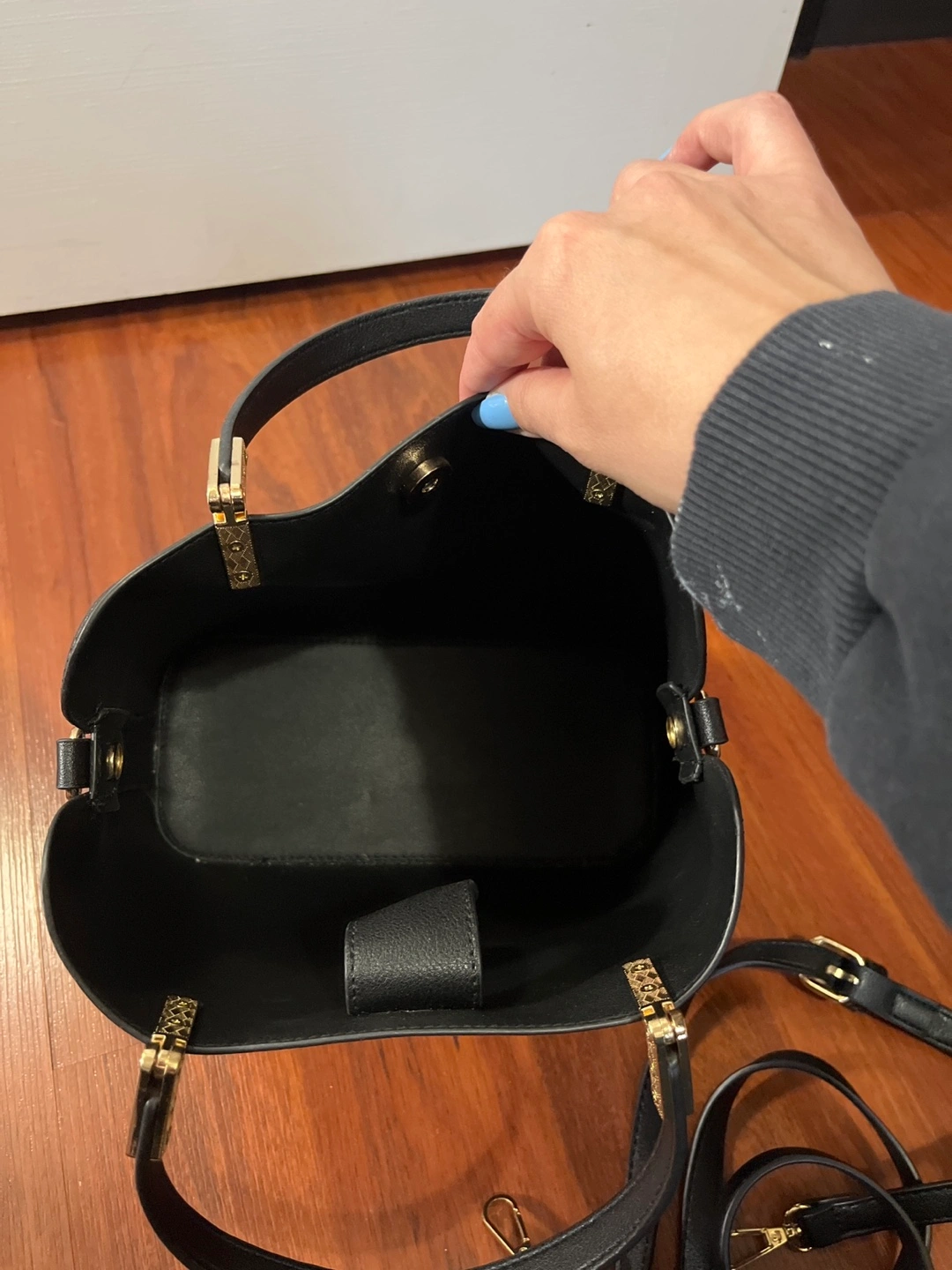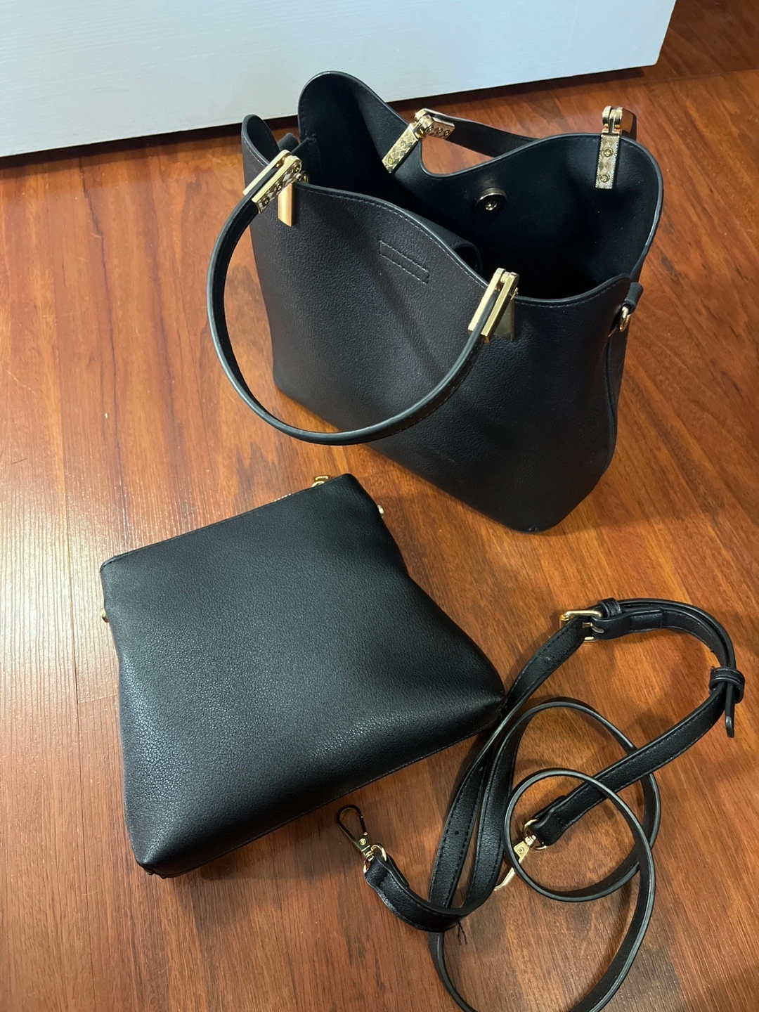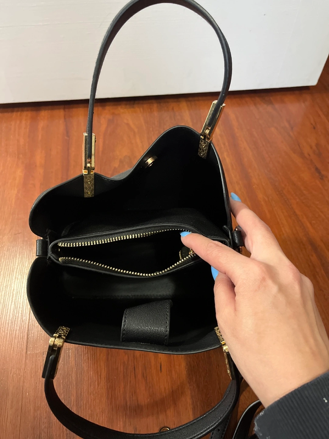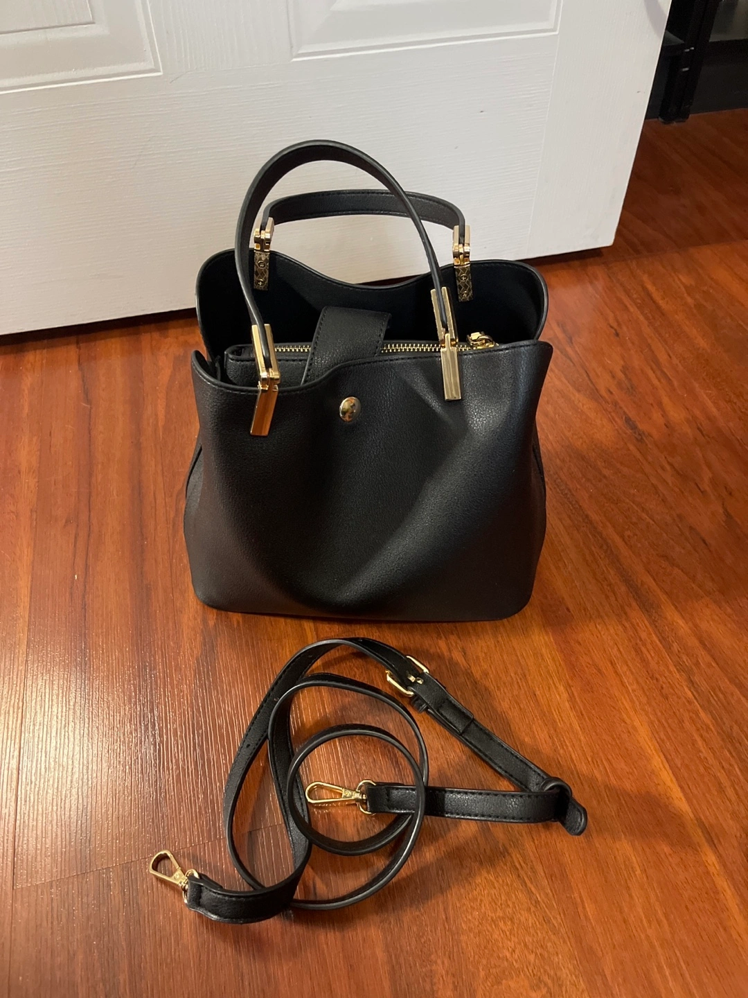 Selling a black handbag that comes with a crossbody strap. It features gold-tone hardware and a top handle, plus a matching inner pouch with zipper. Perfect for everyday use! Middle pouch is removable
