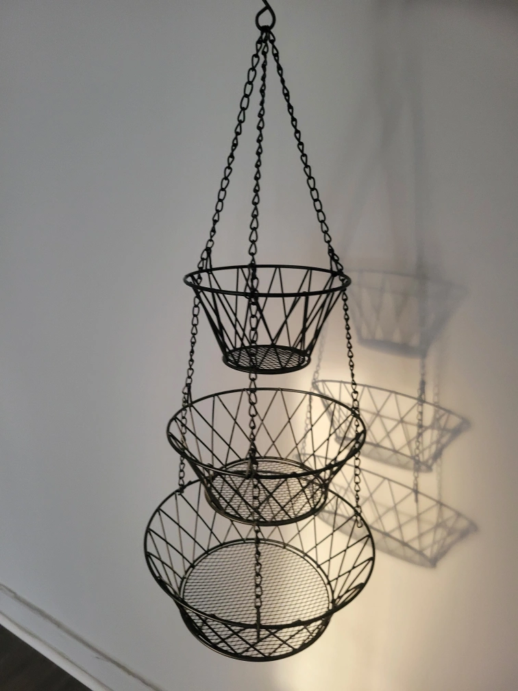 Here's a stylish hanging fruit basket to keep your fruits and veggies organized! It features a three-tier design in black metal, adding a modern touch to any kitchen. Perfect for saving counter space and keeping your produce fresh
