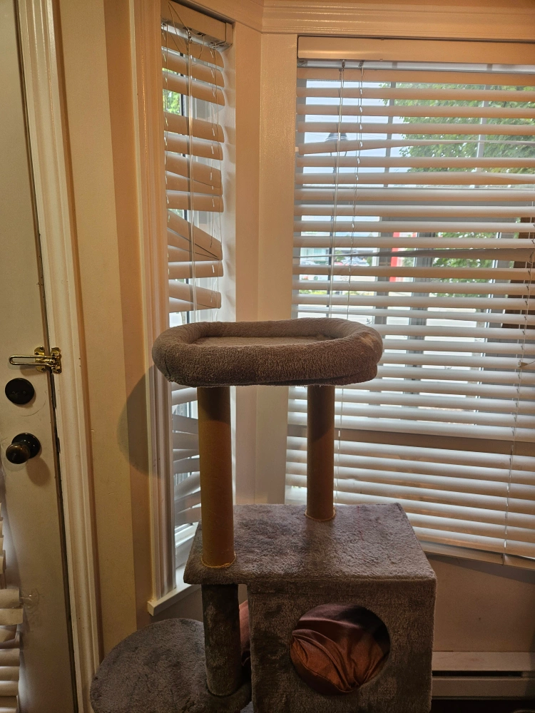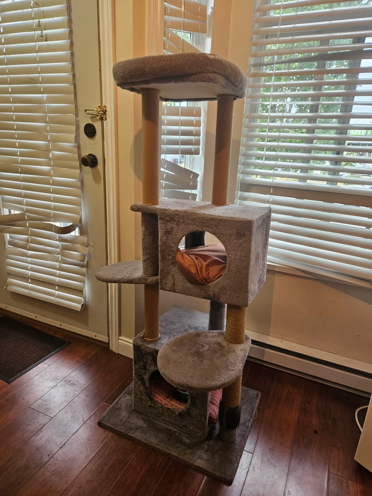 Selling a cat tree in good condition! It has multiple levels for your cat to explore and relax on. It's a sturdy and fun piece of cat furniture for your furry friend.
