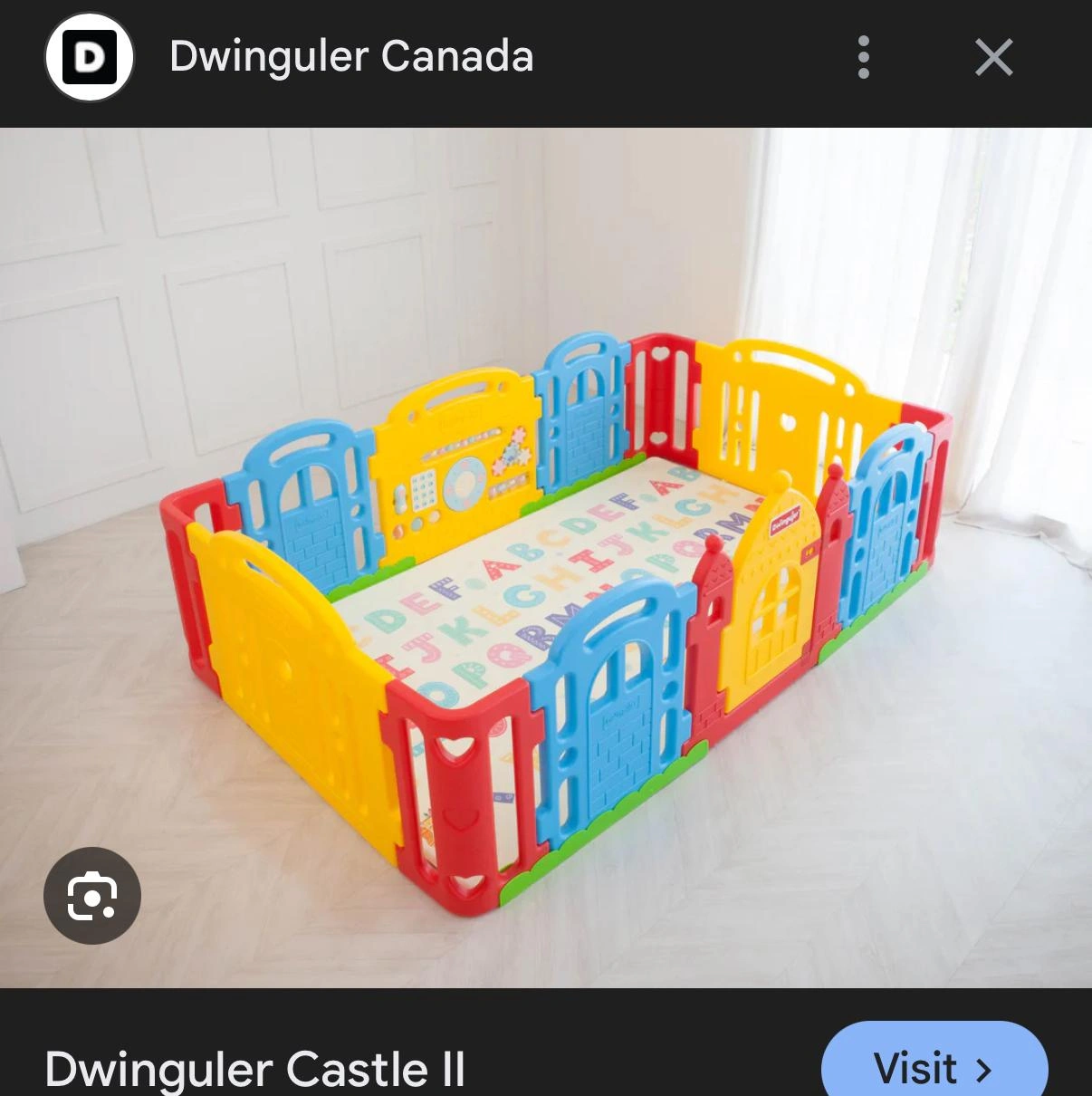 Selling a Dwinguler Castle II playpen! It's in great shape and ready for a new home. This playpen is perfect for keeping your little one safe and entertained. The colorful design is sure to capture their attention! not including the mat.