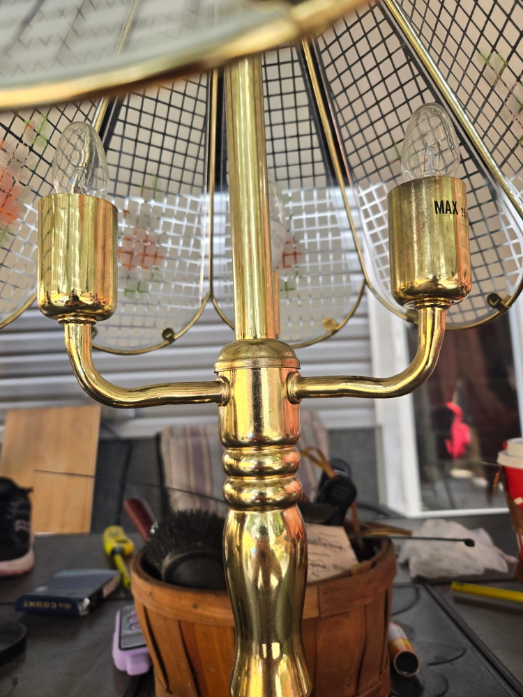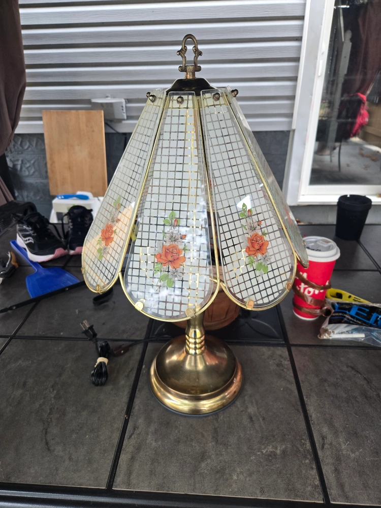 Selling a vintage-style table lamp! It features a gold-tone base and a patterned shade with floral accents. It requires three bulbs, each with a max of 25W.
