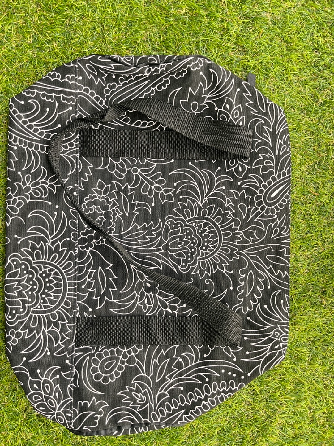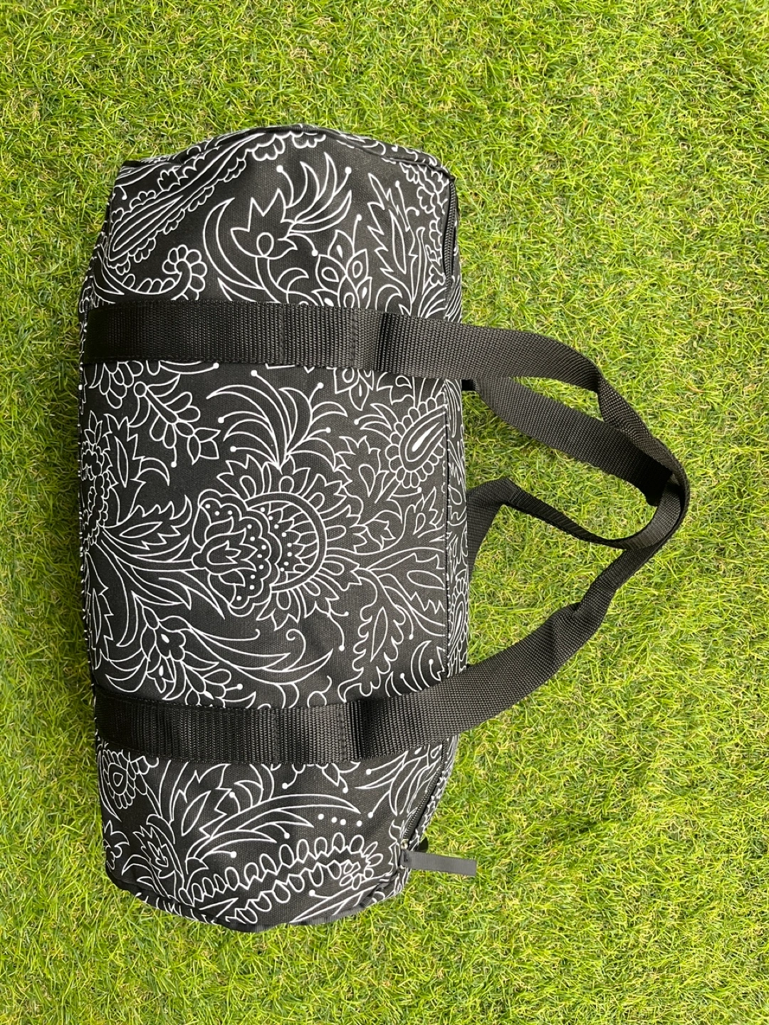 Here's a duffel bag with a nice black and white pattern. It's brand new and ready for your next adventure!