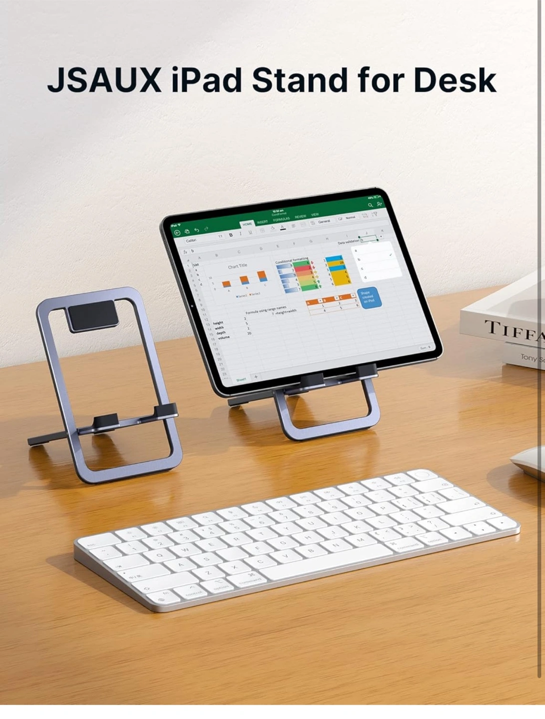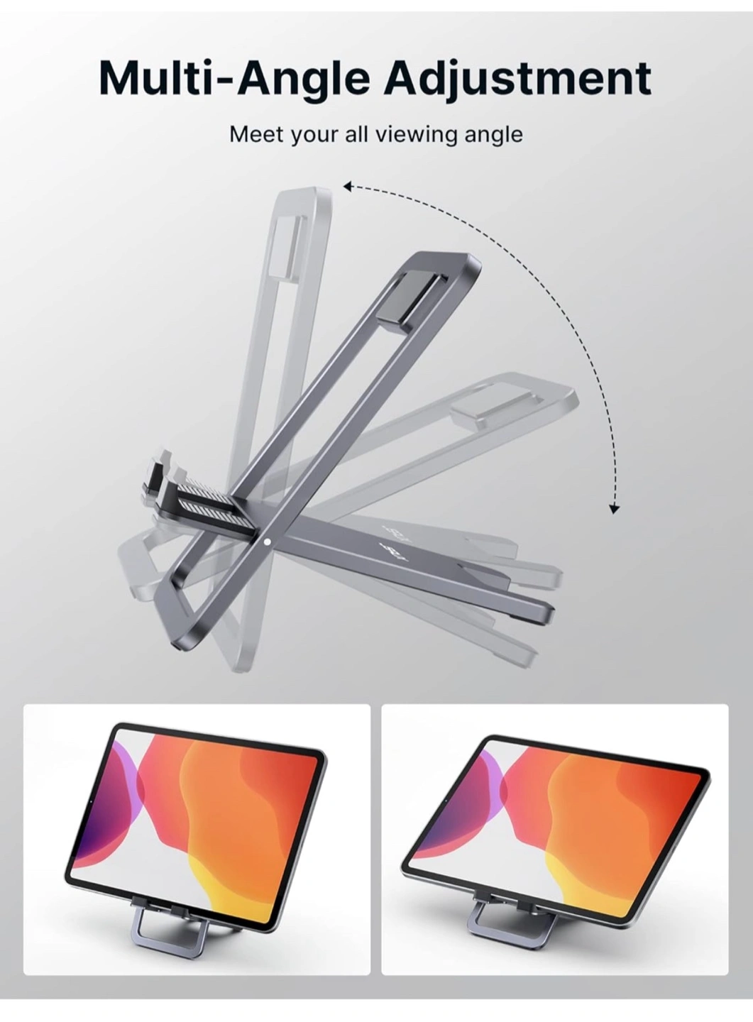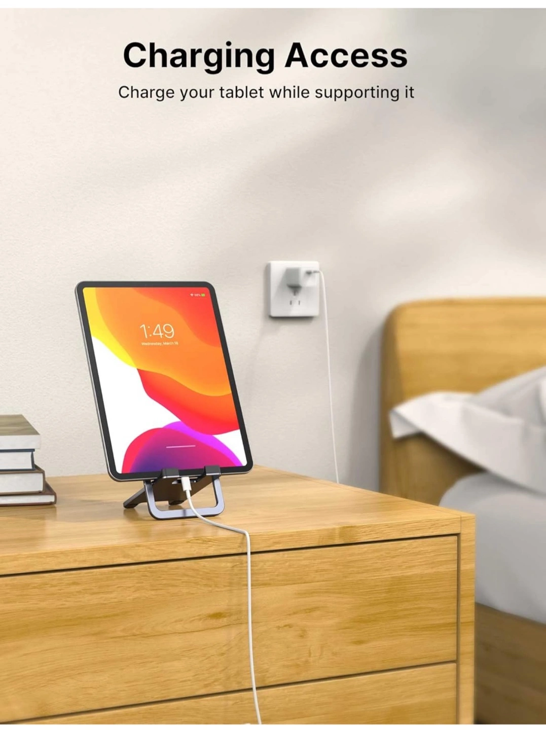 This JSAUX iPad stand is perfect for your desk! It offers multi-angle adjustment so you can always find the perfect viewing angle. It's also easy to carry and pack for travel, folding down to about the size of a cellphone. Plus, you can charge your tablet while it's supported by the stand