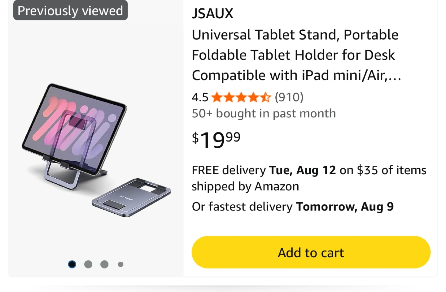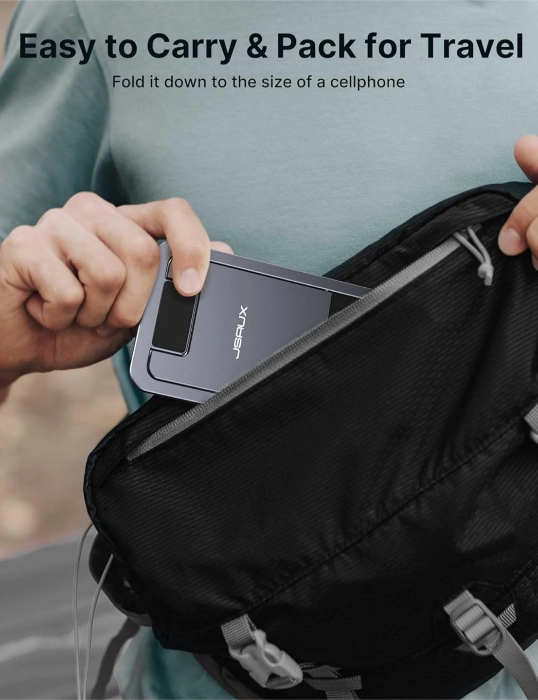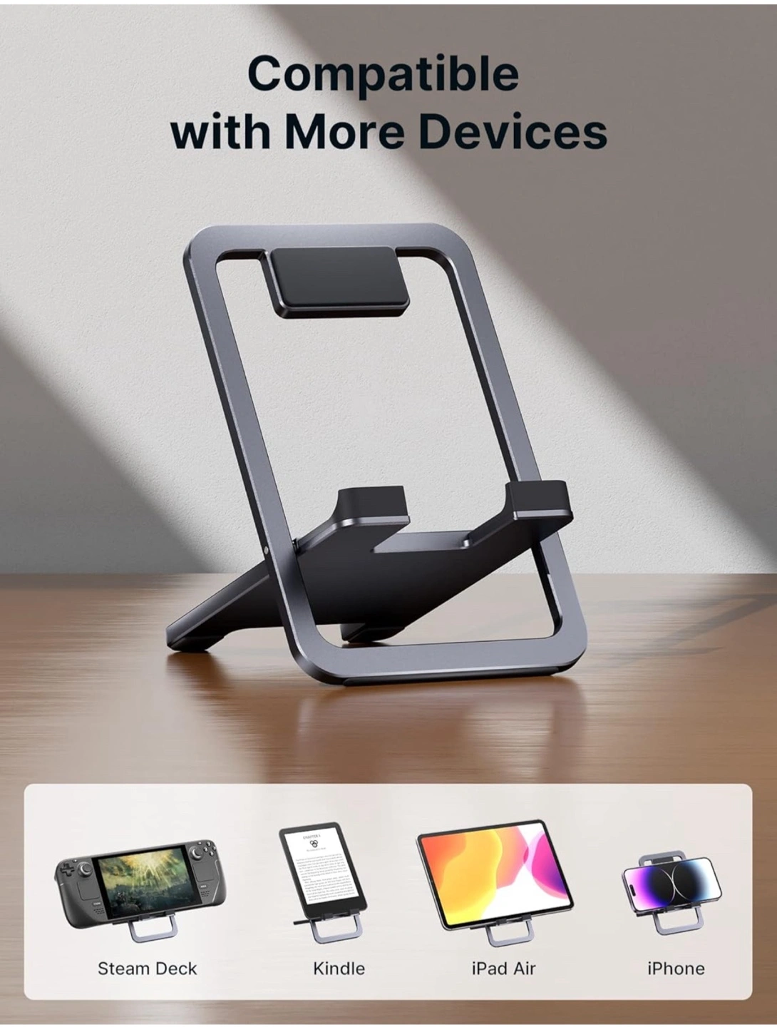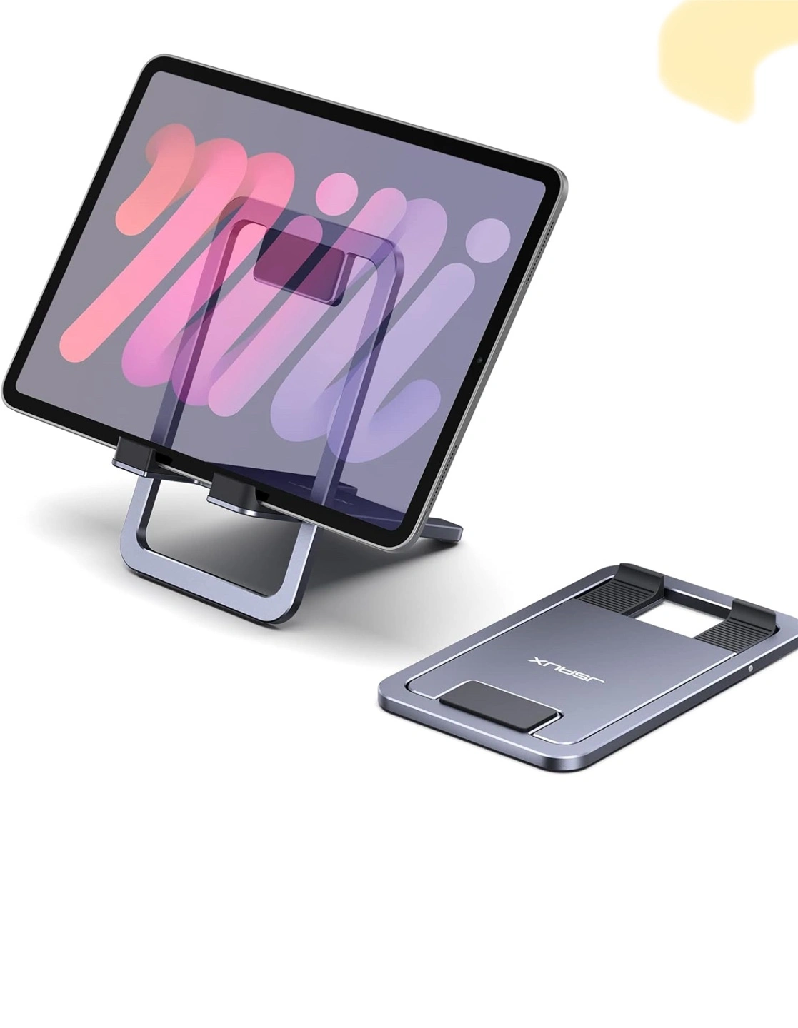 This JSAUX iPad stand is perfect for your desk! It offers multi-angle adjustment so you can always find the perfect viewing angle. It's also easy to carry and pack for travel, folding down to about the size of a cellphone. Plus, you can charge your tablet while it's supported by the stand