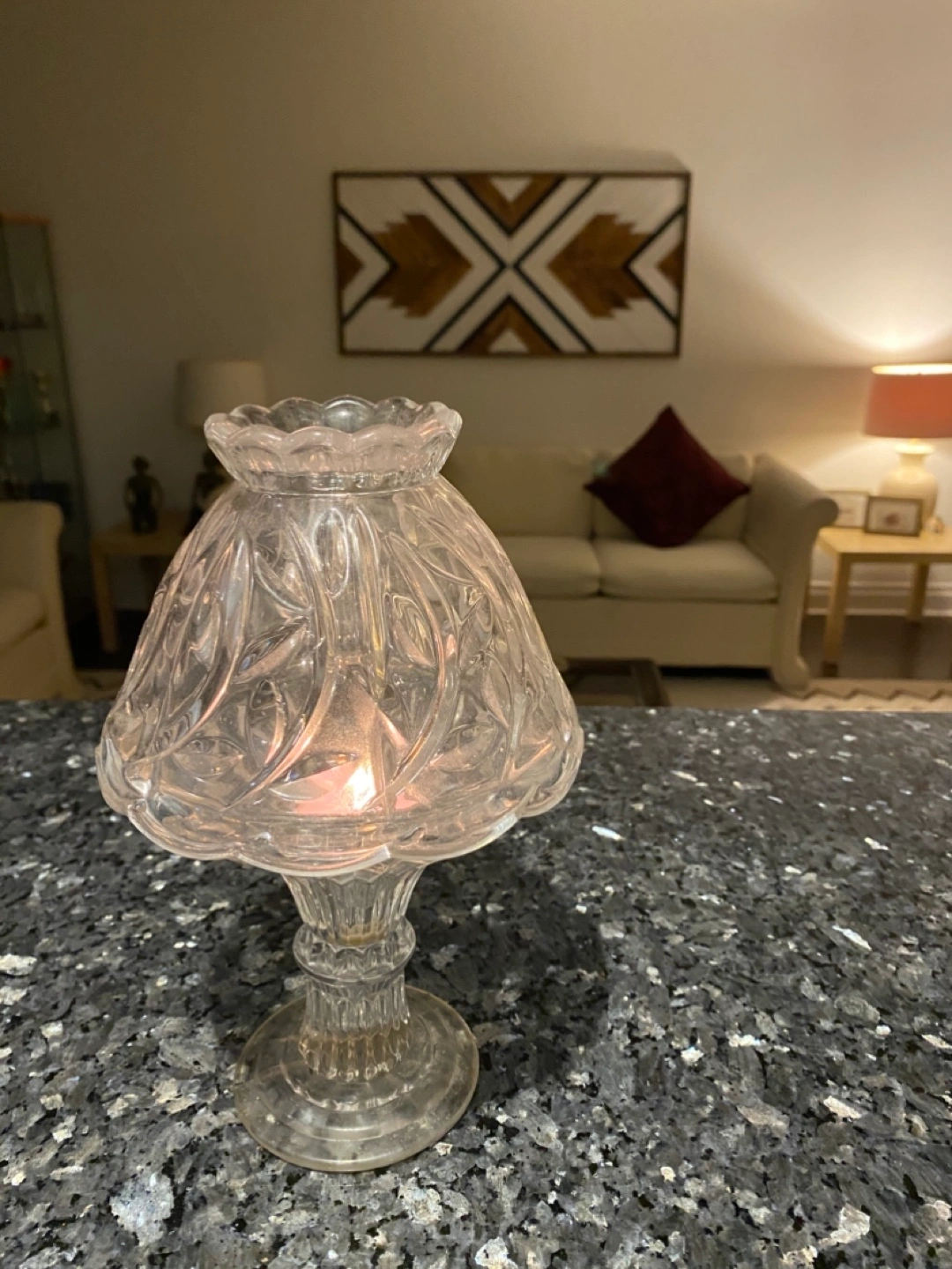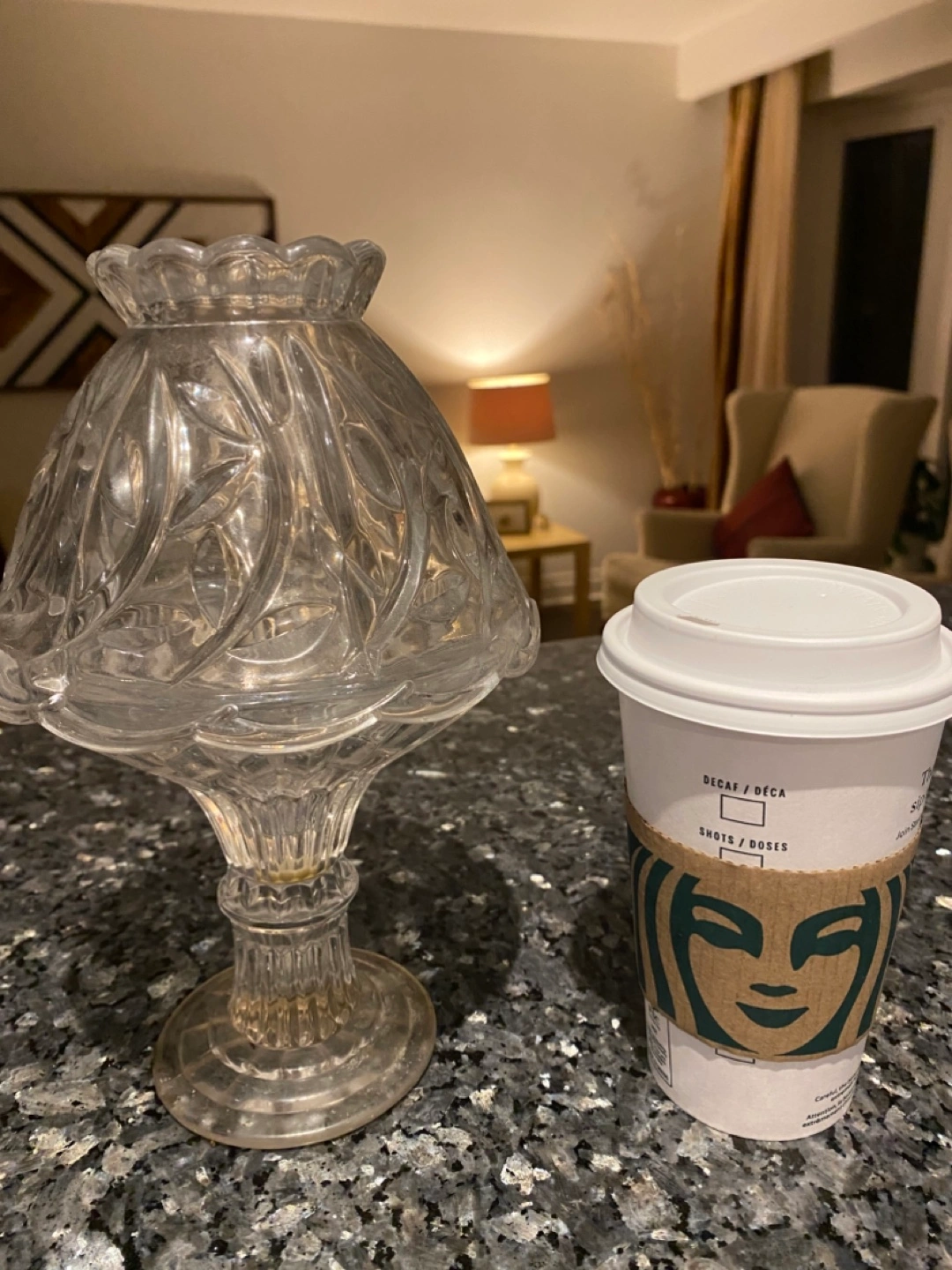 I'm selling a clear glass candle holder. It has a beautiful floral pattern and would look great in any room of your home. It is in great condition and ready for a new home! Starbucks cup is not for sale ๐