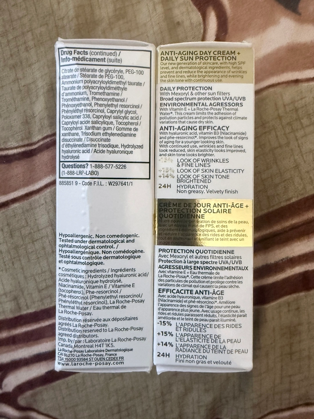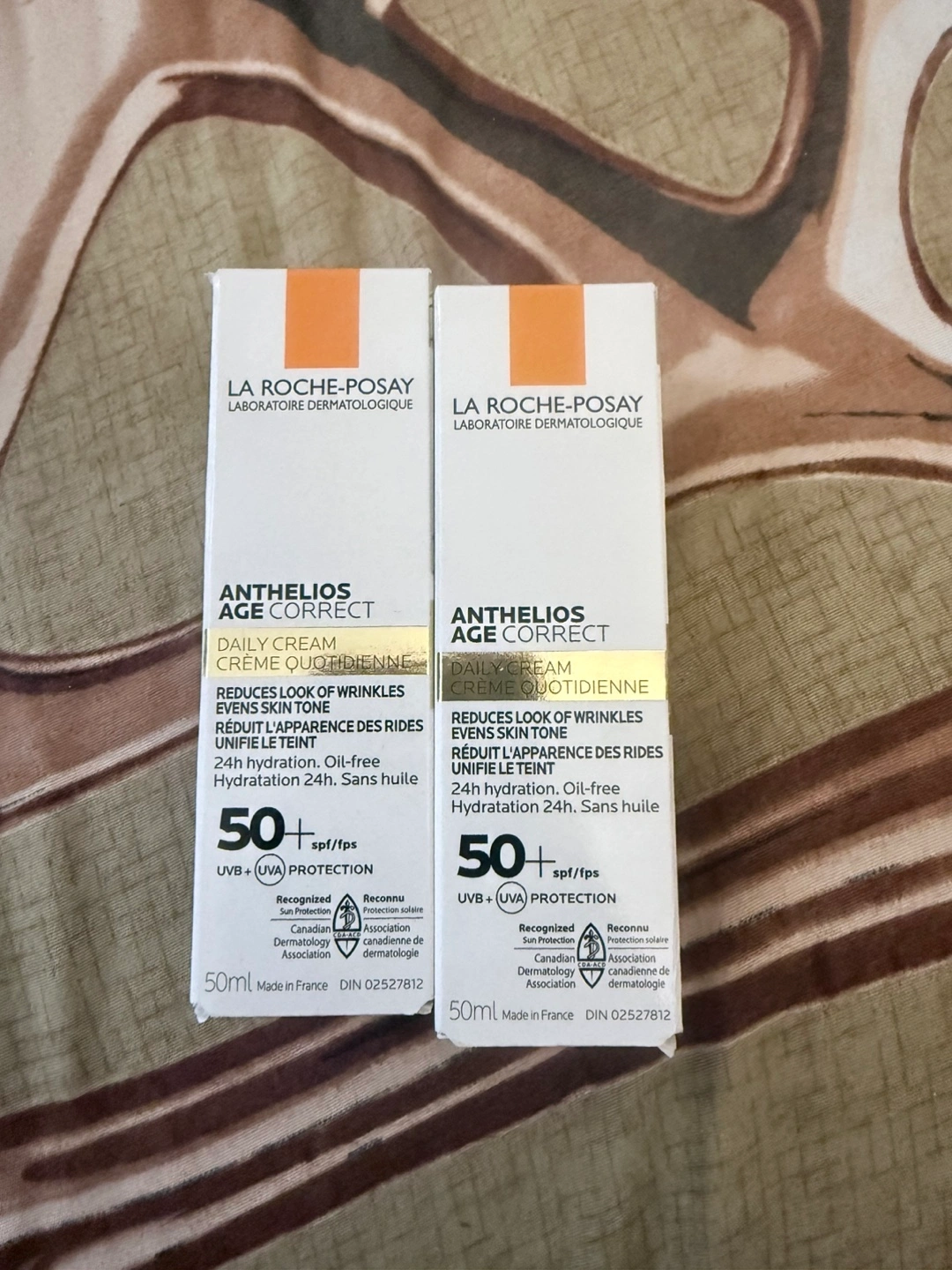 I have two bottles of La Roche-Posay Anthelios Age Correct Daily Cream with SPF 50. It reduces the look of wrinkles and evens skin tone. - Provides 24-hour hydration - Oil-free - Contains Vitamin B3 (Niacinamide) and Vitamin E - Broad spectrum UVA/UVB protection - 50ml each