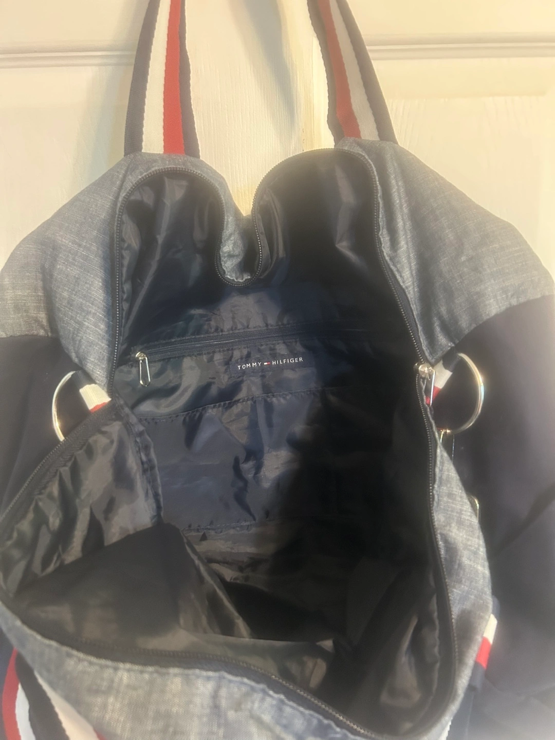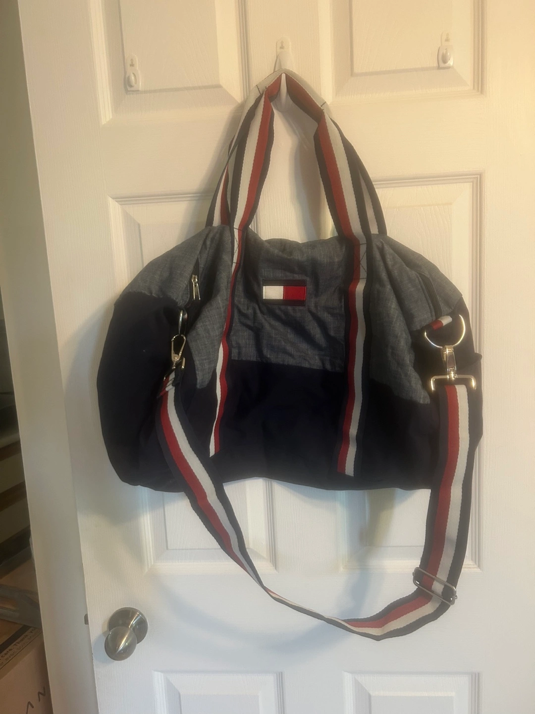 Tommy Hilfiger duffle bag in great condition! It has a navy blue and gray colour scheme with the classic red, white and blue stripes on the straps. Perfect for gym trips or weekend getaways! Fits 50x60 blanket
