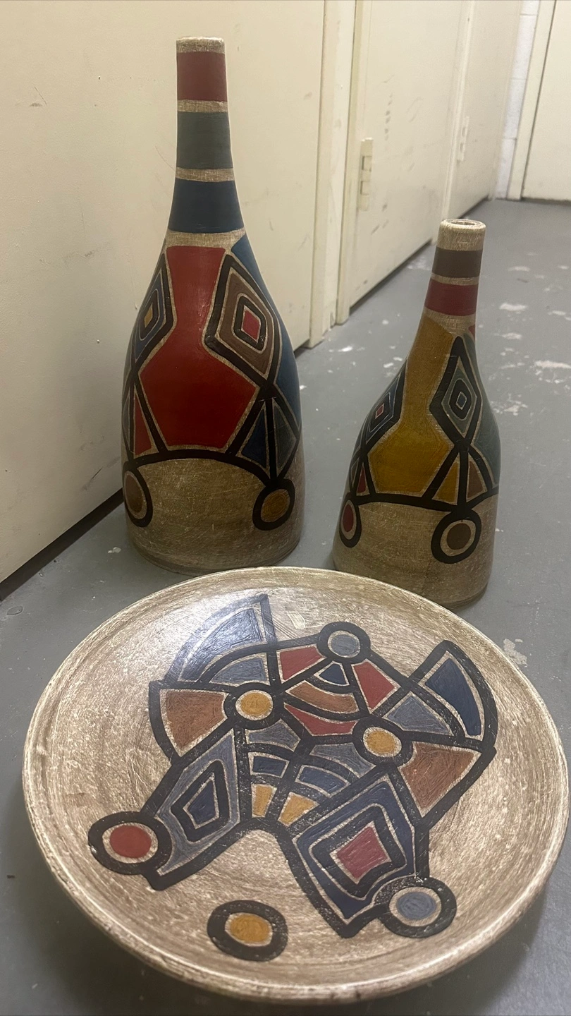 I'm selling a set of decorative vases and a plate. The set features a unique, colourful geometric design. They would make a great addition to any room!