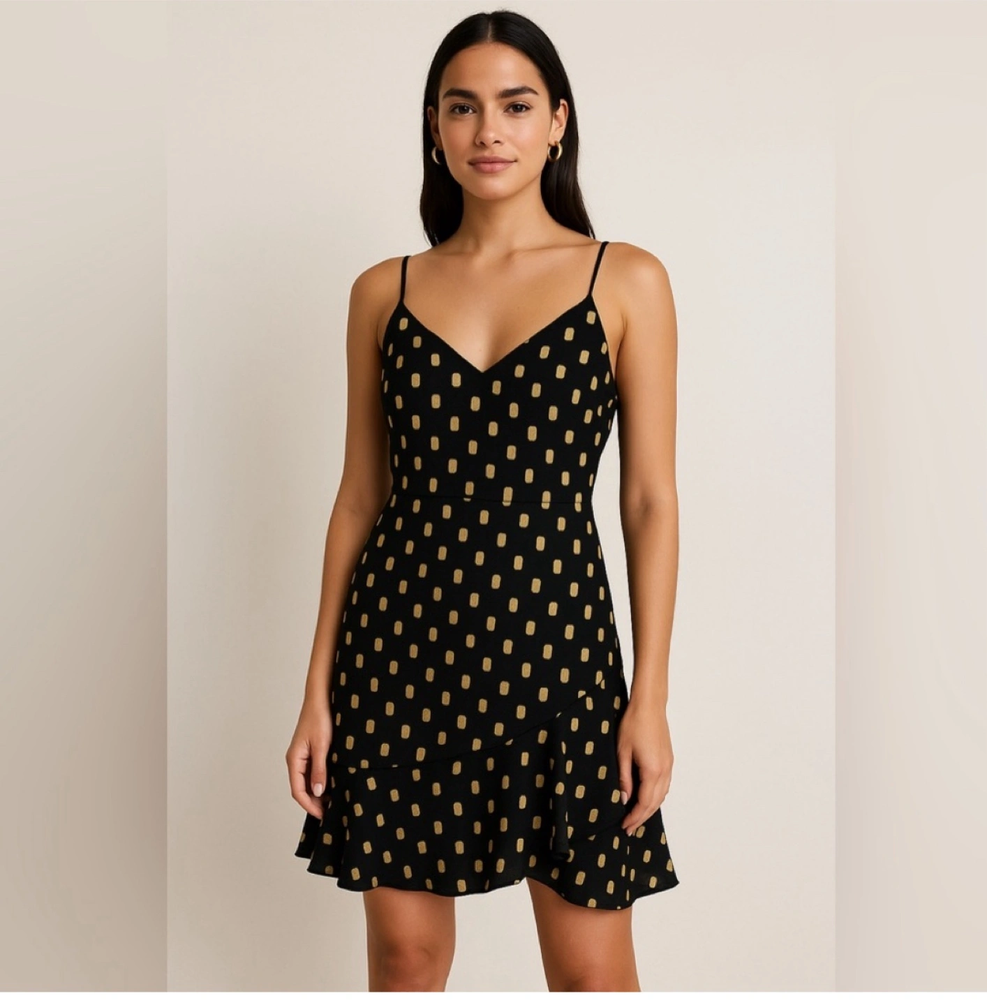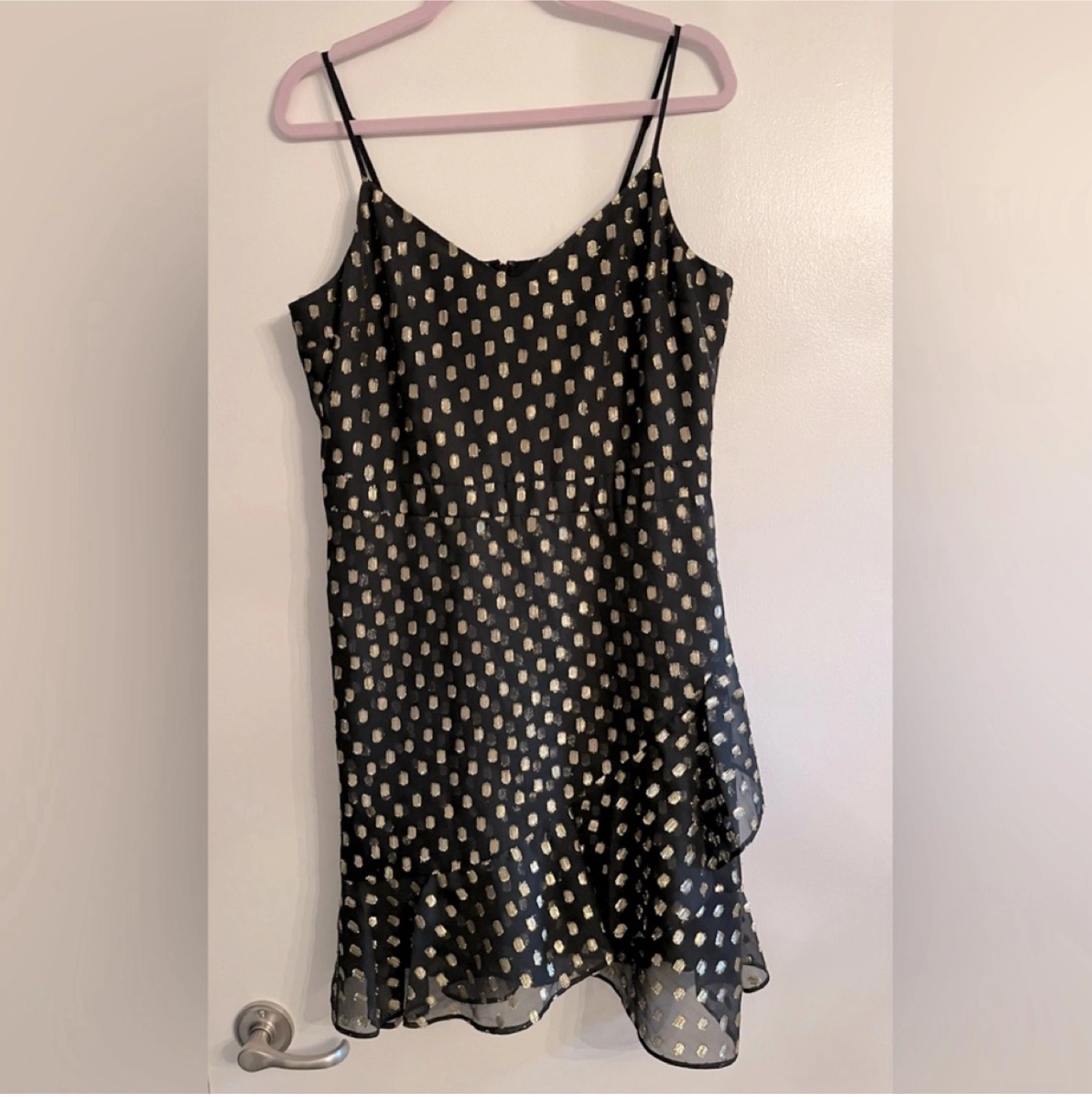Cute black mini dress with gold thread accents. It features adjustable straps and a ruffled hem. Back zipper. Perfect for a night out or a special occasion. Pit to pit 19β Waist 16β Length 35β
