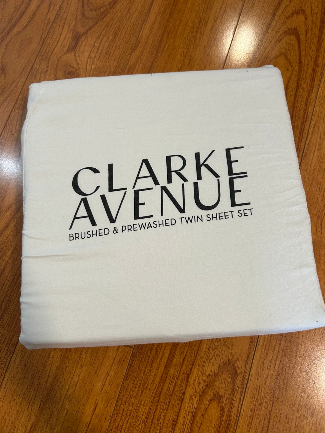 I'm selling a Clarke Avenue twin 3-piece sheet set. It's brushed and prewashed for extra softness. The set includes: - One flat sheet (66" x 96") - One fitted sheet (39" x 75") - One pillowcase (20" x 30") Originally bought for $49.00 plus tax