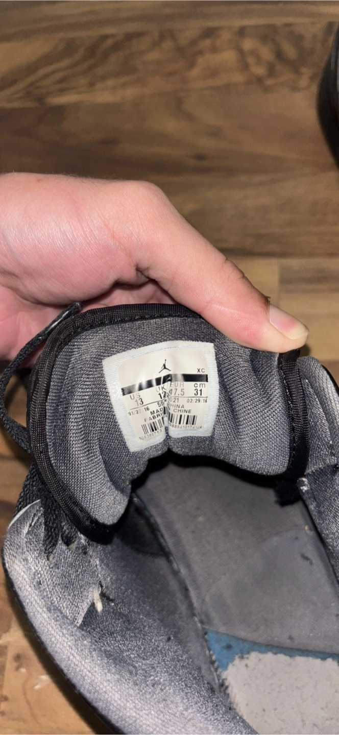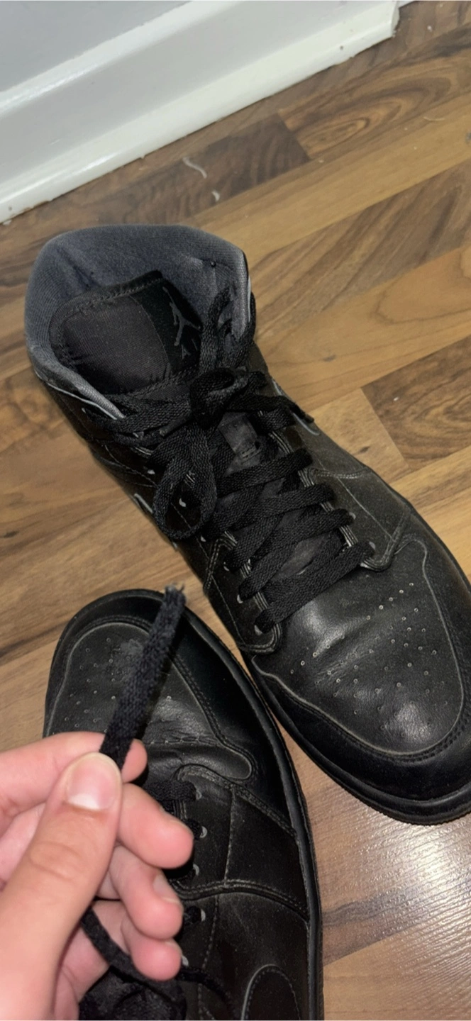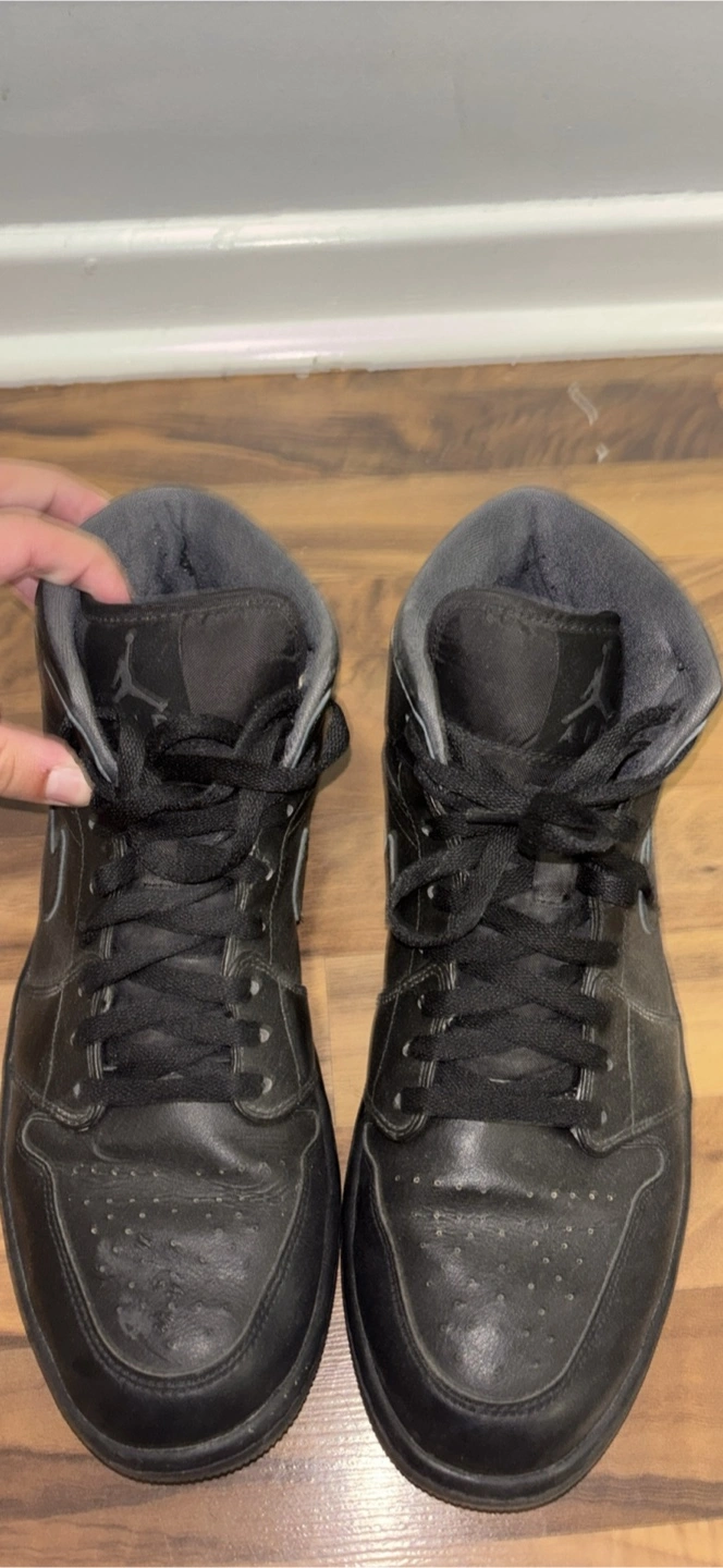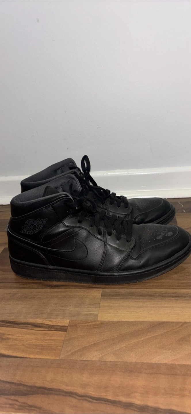 Selling a pair of Jordan 1 Mid sneakers in black. They are size 13 US. These shoes show signs of wear as pictured, but still have lots of life left!