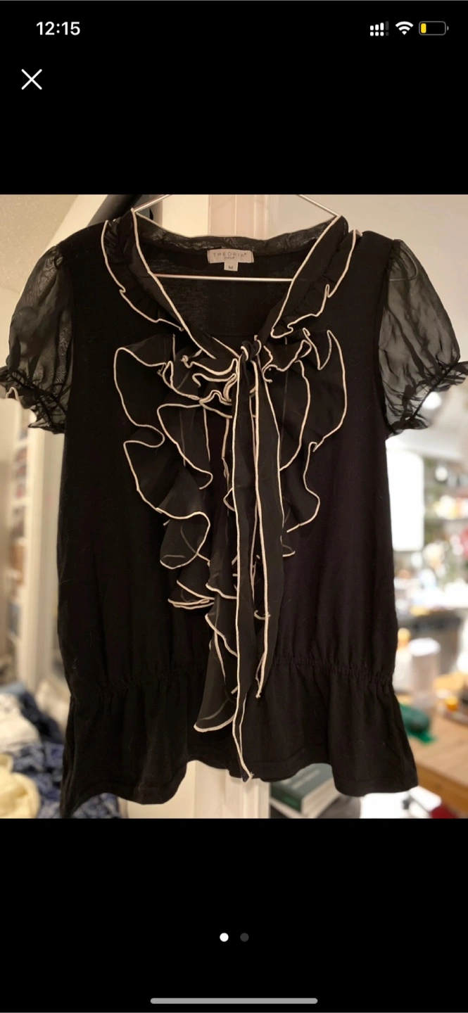 Rena black blouse with ruffle detailing. It's a size small/medium and in great condition! The blouse features sheer short sleeves and a tie at the neck. Perfect for dressing up or down I can meet at Adelaide east & sherbourne or king station most of the days!