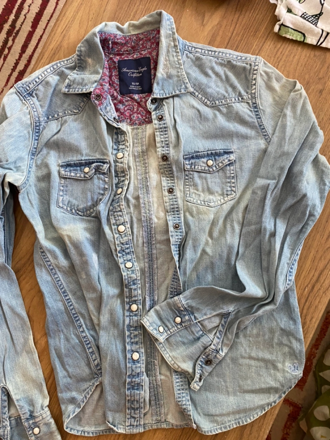 Selling an American Eagle Outfitters denim western shirt in size XS. It's a light wash denim with a unique floral pattern inside the collar. Great for a casual, stylish look! I can meet at Adelaide east & sherbourne or king station most of the days!