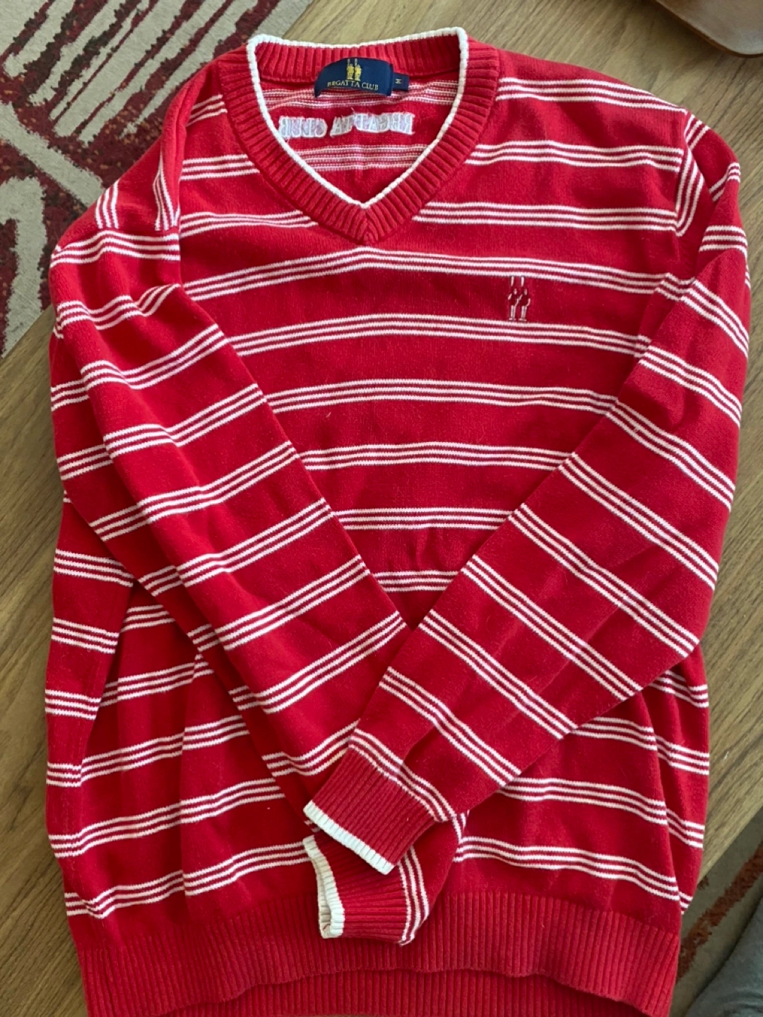 Selling a Regatta Club V-neck sweater. It's a size medium with a red and white striped pattern. Perfect for a casual look! 100% cotton I can meet at Adelaide east & sherbourne or king station most of the days!