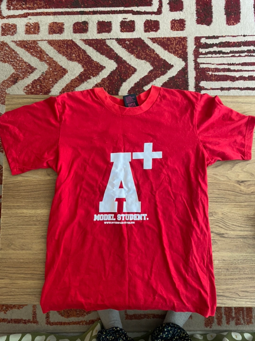 Red t-shirt with printed designs on the front and back. One side says 'HELLO TEACHER GOOD MORNING & GOOD BYE FEVER' and the other side says 'A+ MODEL STUDENT'. I can meet at Adelaide east & sherbourne or king station most of the days!