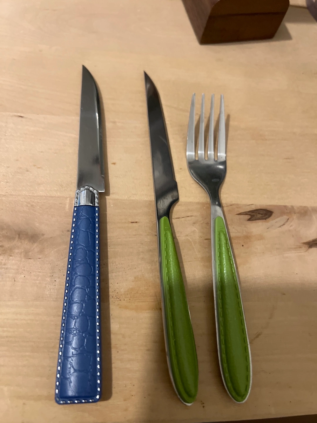 Selling a set of 12 blue knives and a set of 6 green knives and forks. The knives have unique handles, one with a blue textured design and the other with a green handle. They're in great shape and ready for your next meal! Made it Turkey