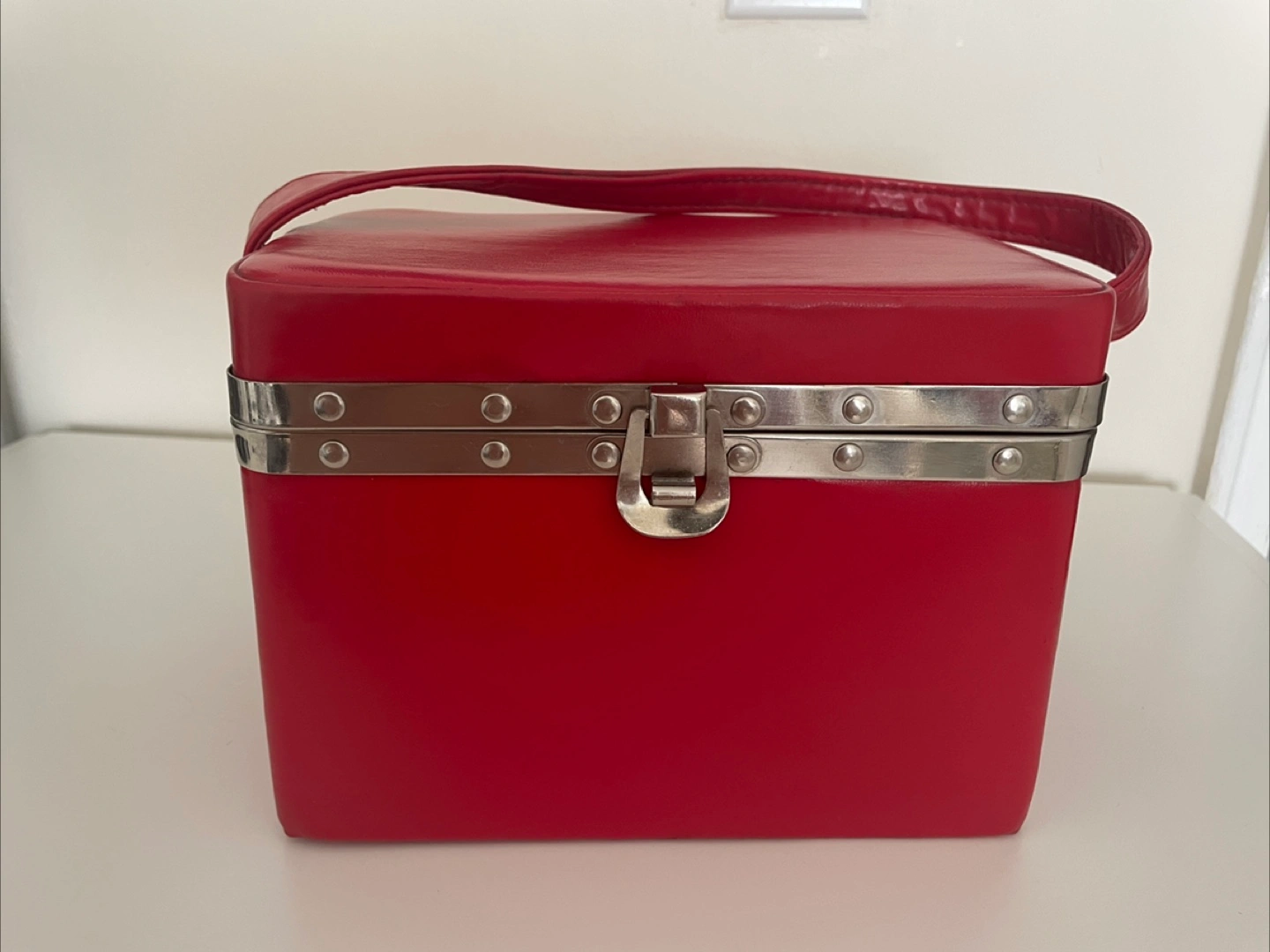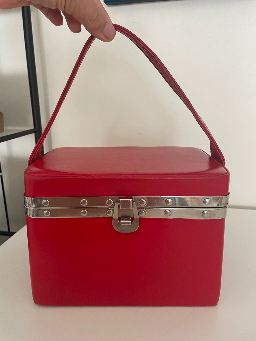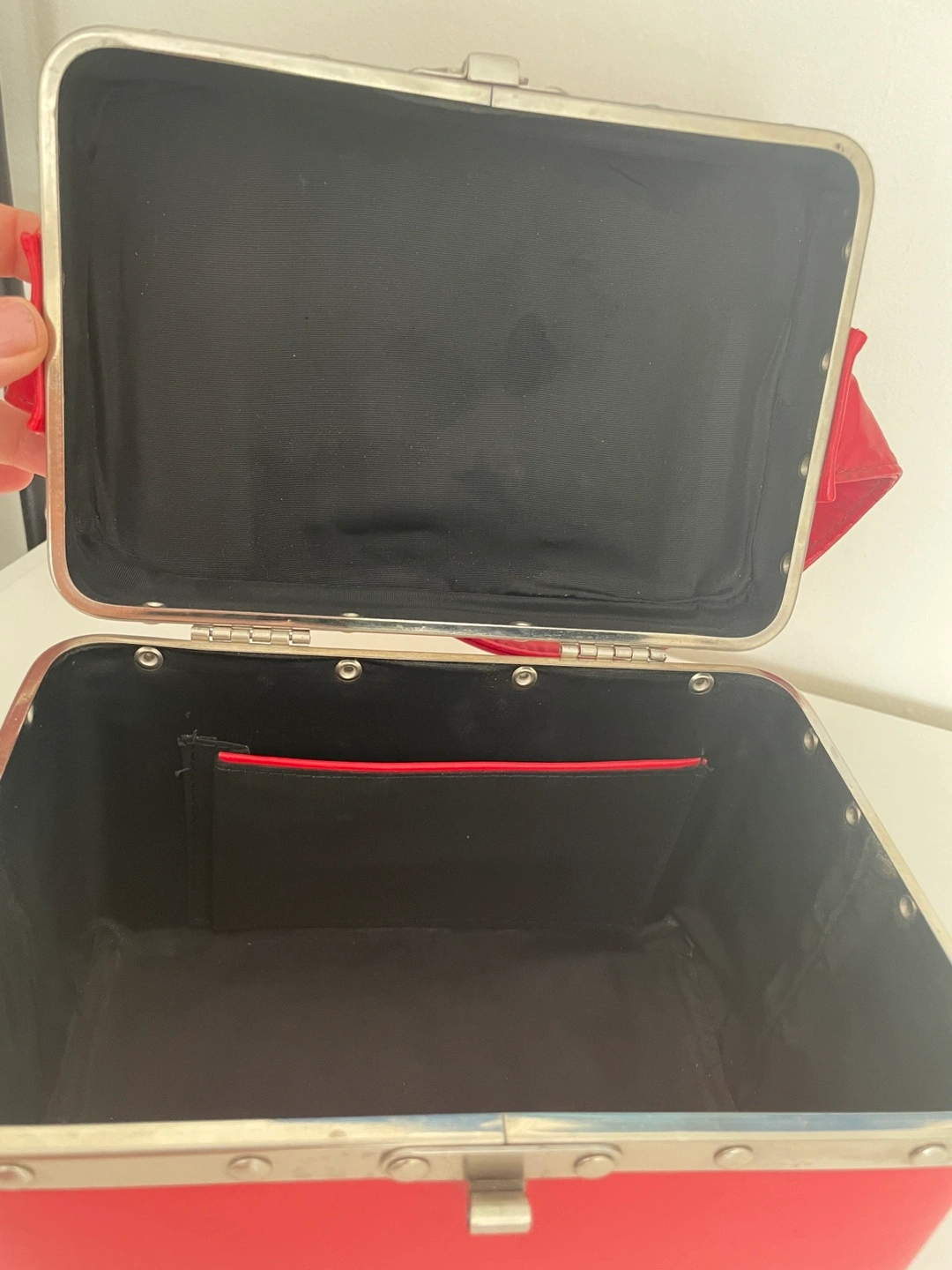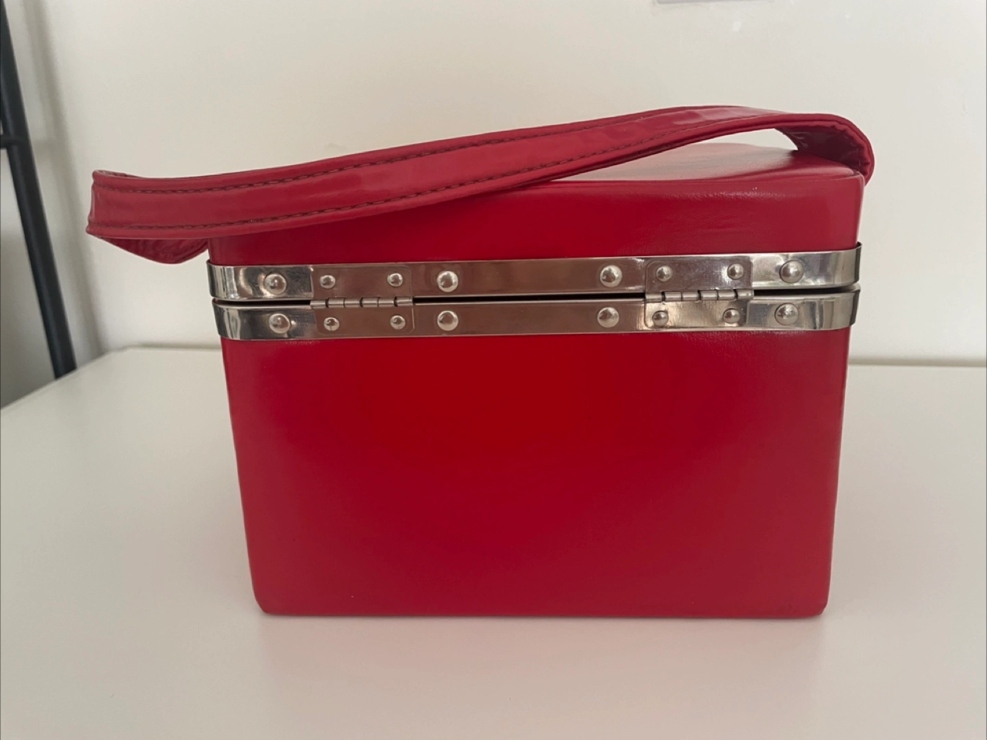 Selling a trendy accessory: red vanity case bag with strap. It has a silver-tone metal trim and a clasp closure. The interior is lined with black fabric and includes a small pocket. Very good condition.