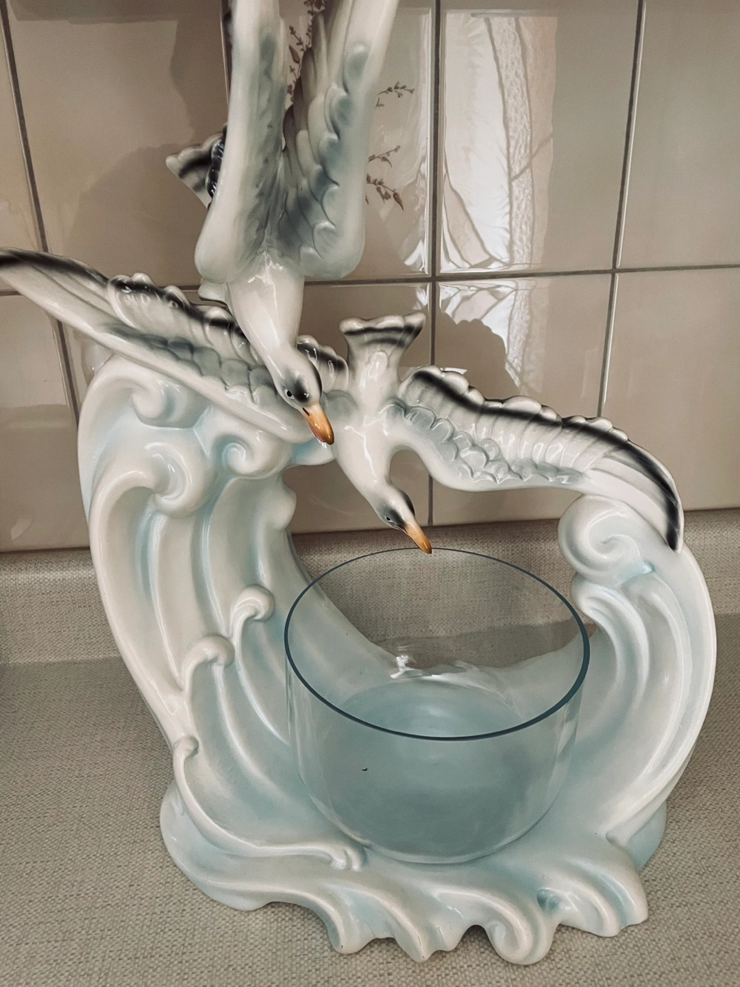 A beautiful ceramic candle holder featuring seagulls perched above a wave design with a glass insert. Would look great as a decorative piece in any room!