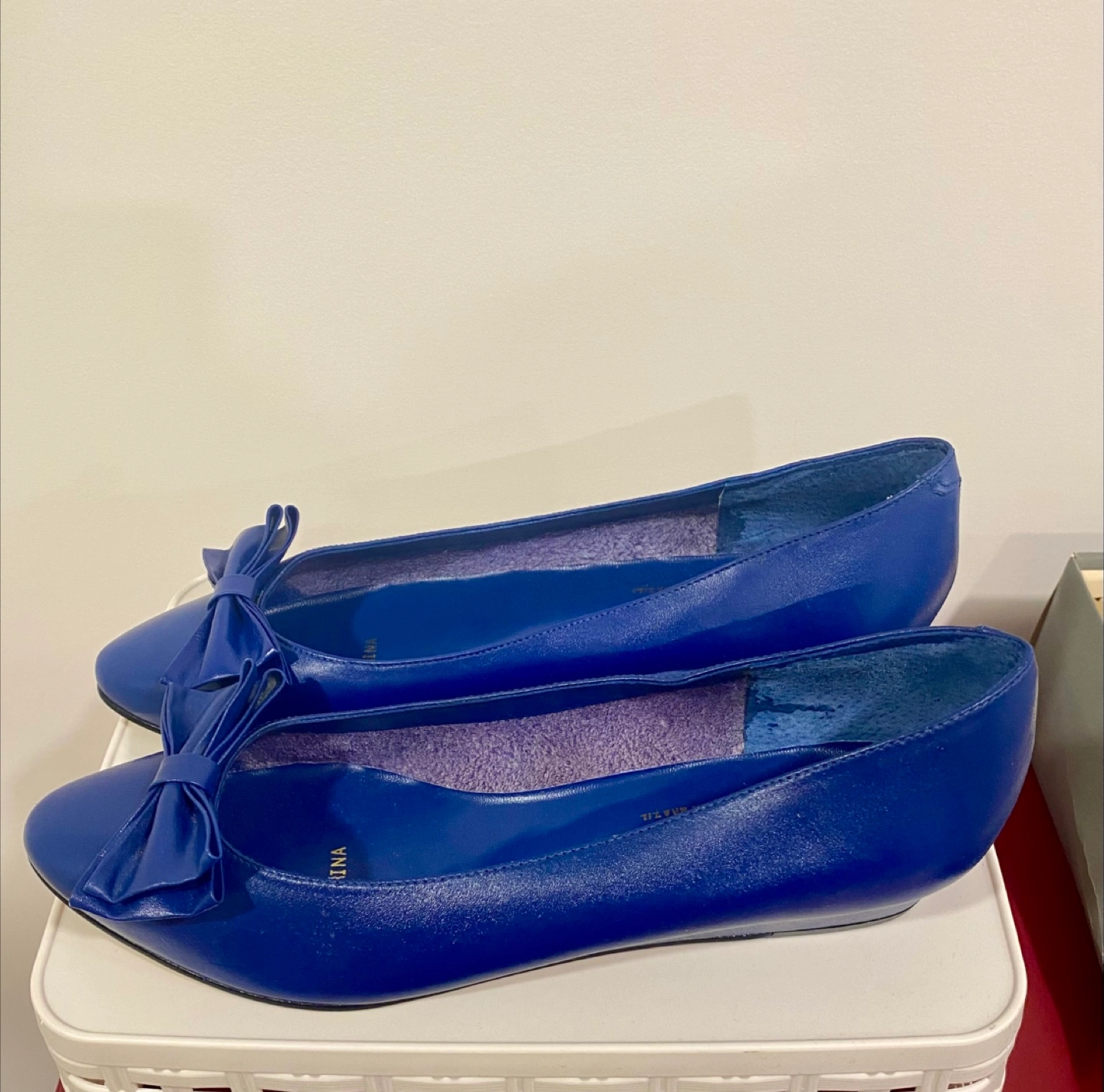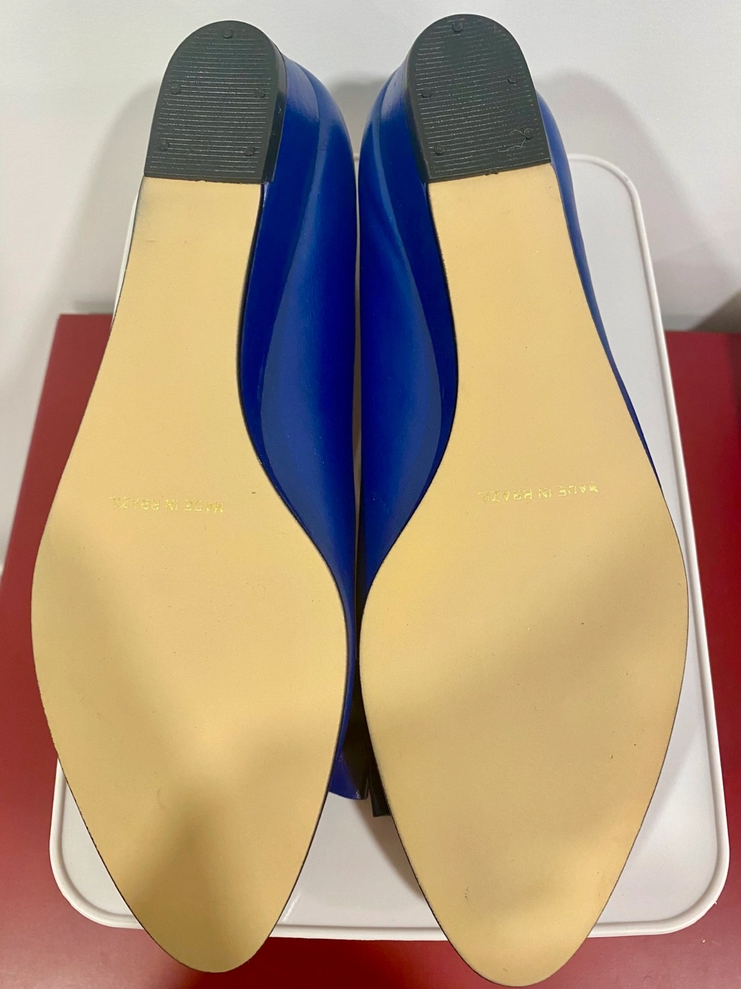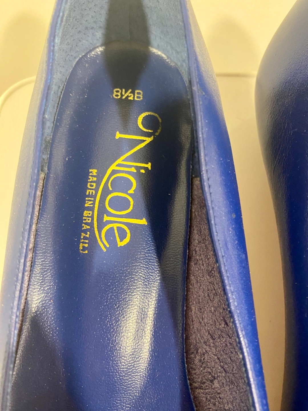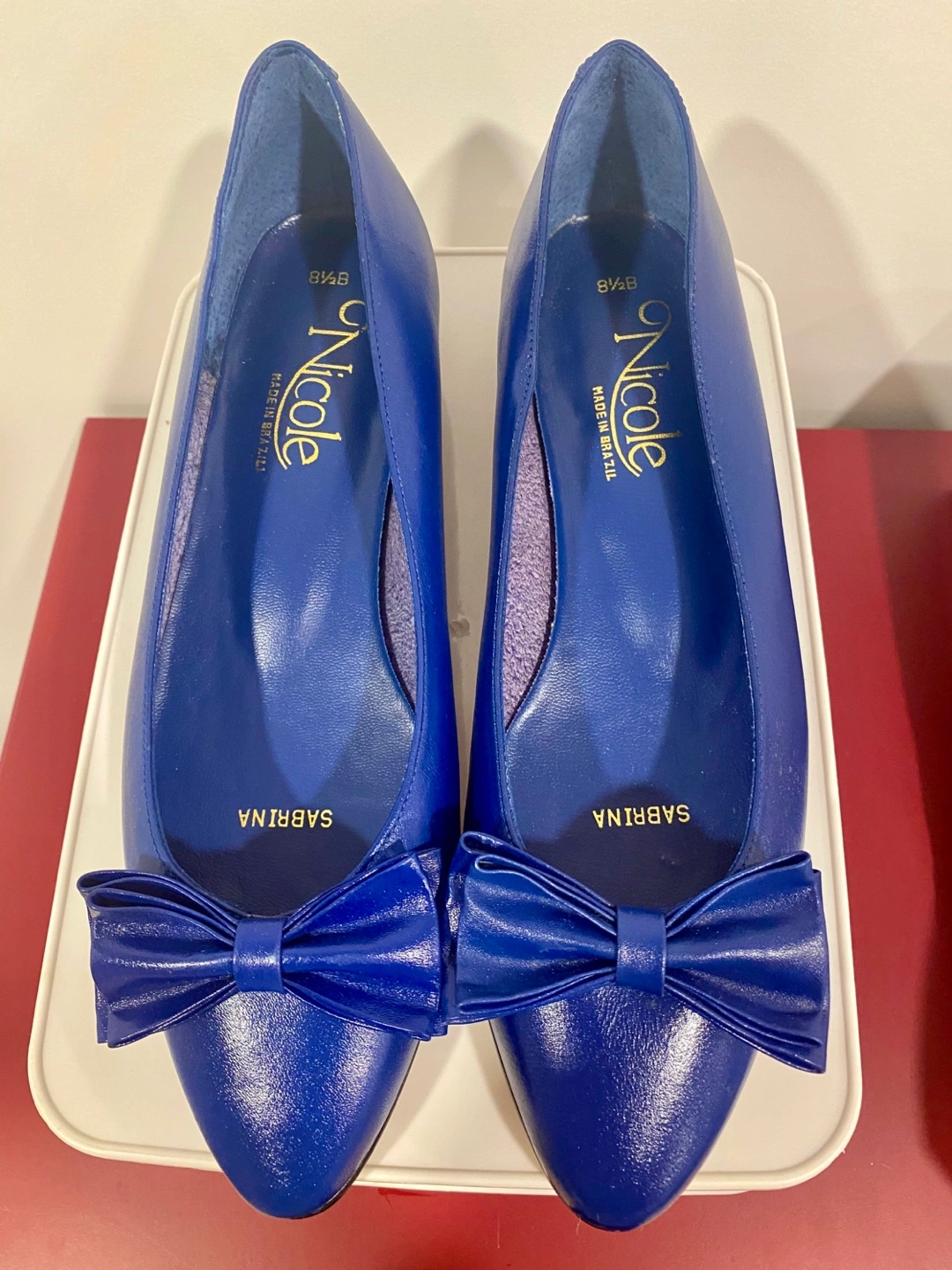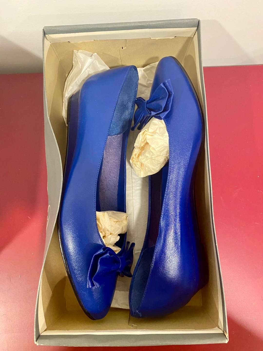 Vintage Royal Blue Women ’s Shoes Ballet Flat Style Cute bow detail Pleather Vintage New/Deadstock 1980s Comes with original box Size 8.5 Total length from toe to heel is 10” Pick up in East York at O’Connor & Greenwood.