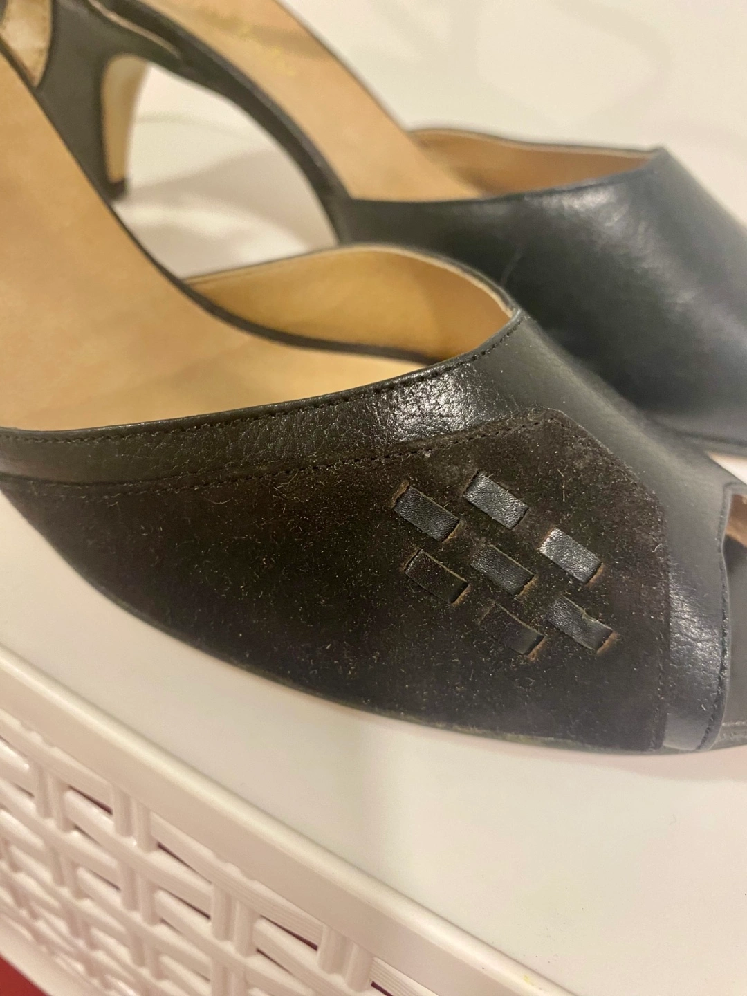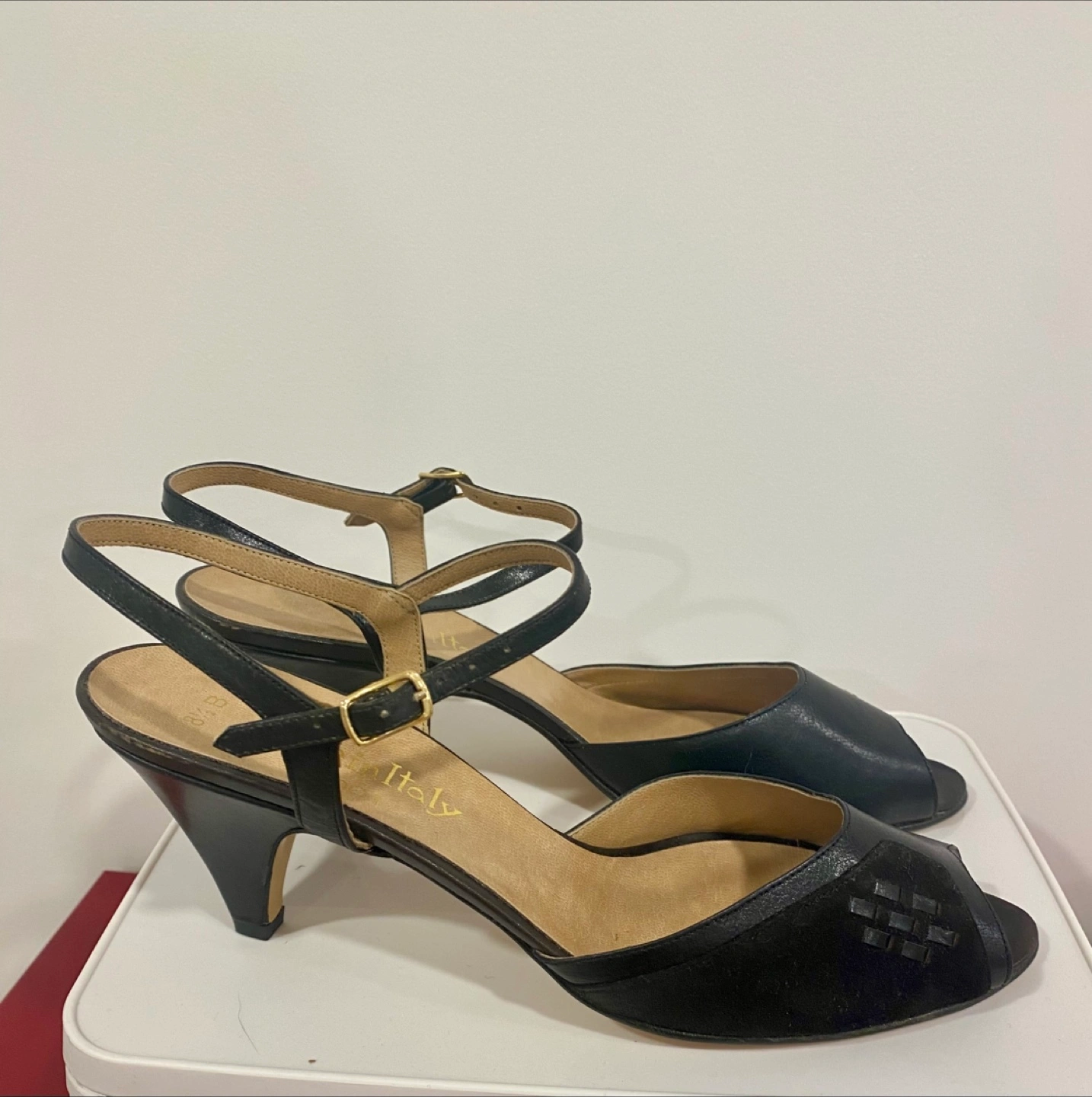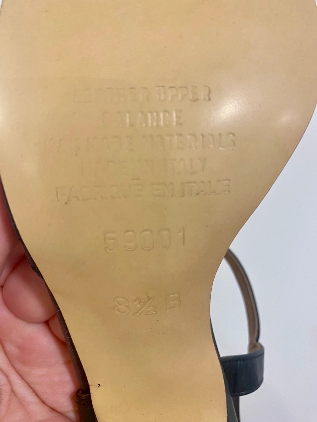 Vintage Leather High Heels Strappy open-toe sandal heel Genuine Leather Made in Italy Vintage 1980s/1990s Comes with original box. These shoes appear to be new, however have a few scuffs on the bottom soles. Otherwise they are in like new condition. Size 8.5 Total length of shoe from tip to heel is 10” Total length of high heel is 2.5” Pick up in East York at O’Connor & Greenwood.