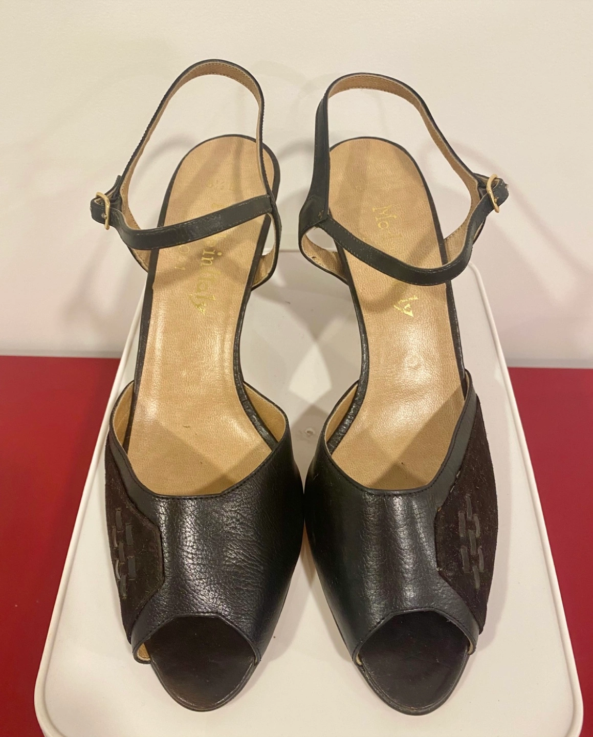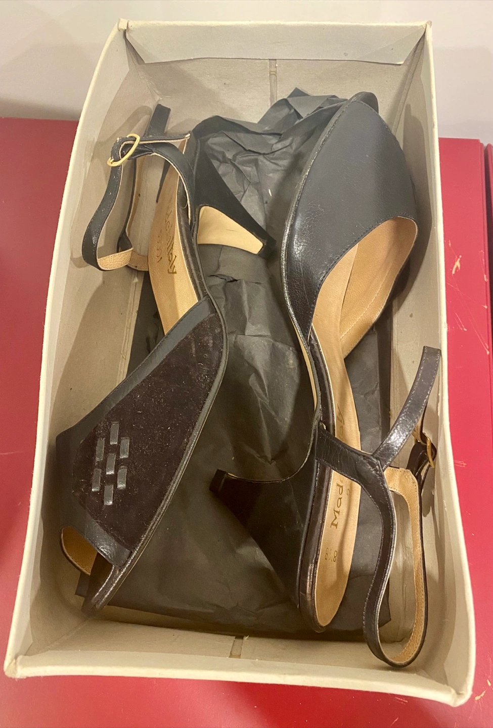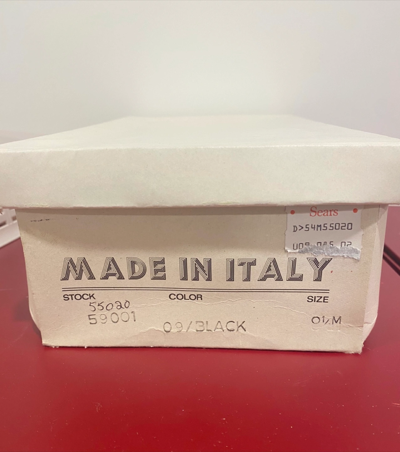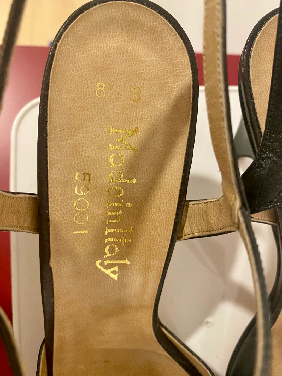 Vintage Leather High Heels Strappy open-toe sandal heel Genuine Leather Made in Italy Vintage 1980s/1990s Comes with original box. These shoes appear to be new, however have a few scuffs on the bottom soles. Otherwise they are in like new condition. Size 8.5 Total length of shoe from tip to heel is 10” Total length of high heel is 2.5” Pick up in East York at O’Connor & Greenwood.