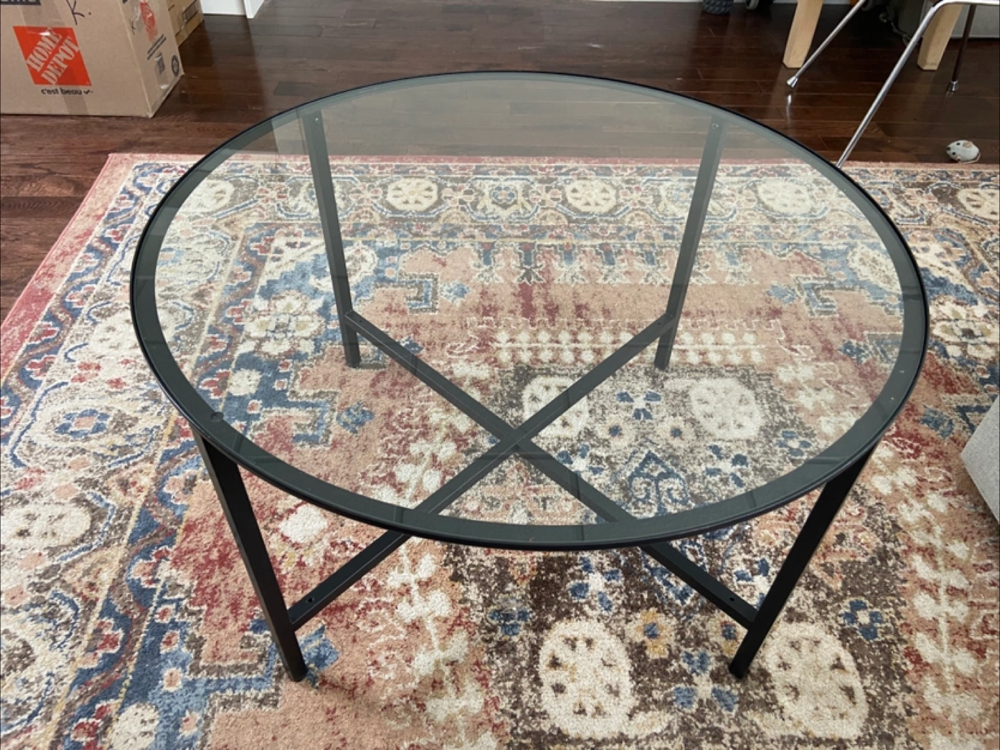 In great condition. Selling a coffee table with a sleek design! It features a glass top and a lower shelf for storage or display. Bottom shelf can be removed for a different look. The dimensions are: 75 cm (29 1/2") in diameter 45 cm (17 3/4") in height