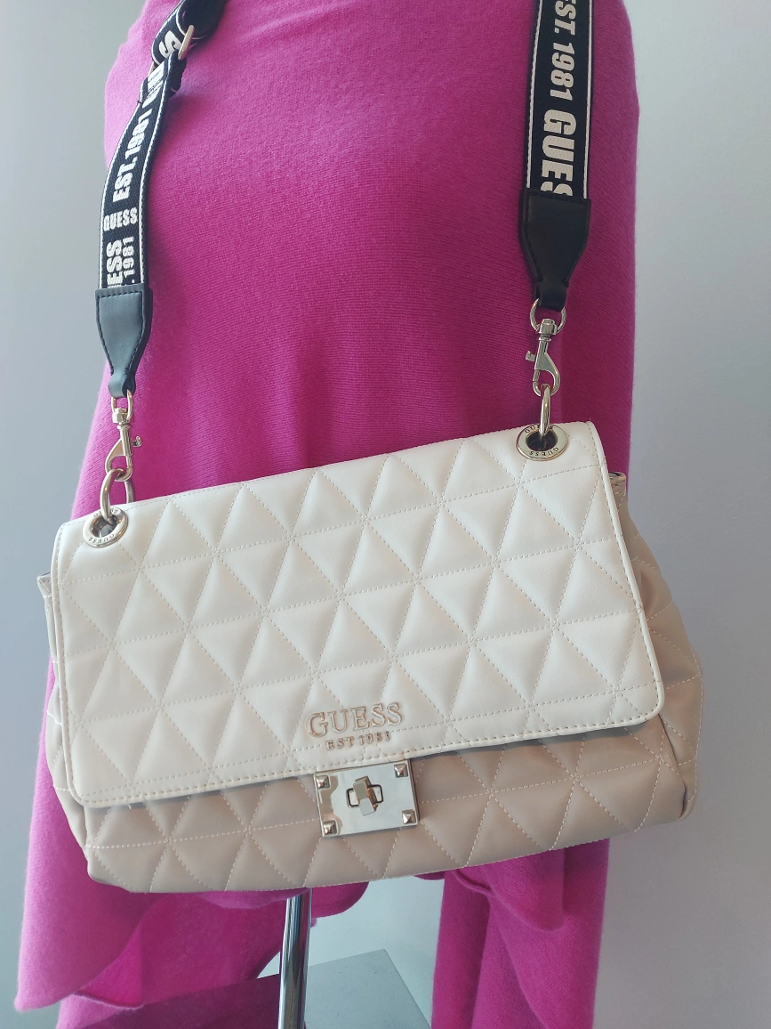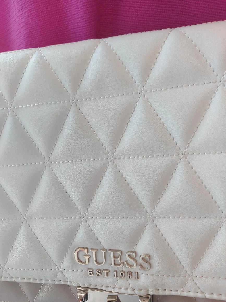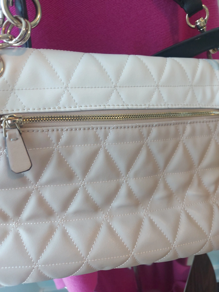 Selling a lovely Guess quilted shoulder bag! It's in great condition and features a stylish quilted design. The bag is a cream colour and has a Guess logo on the front. Perfect for everyday use or a night out! RESERVED