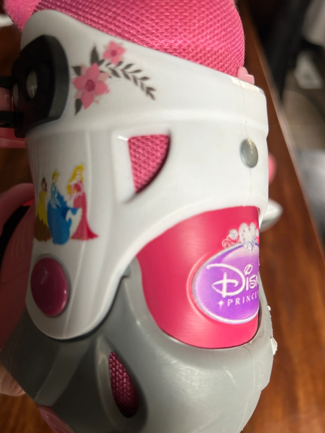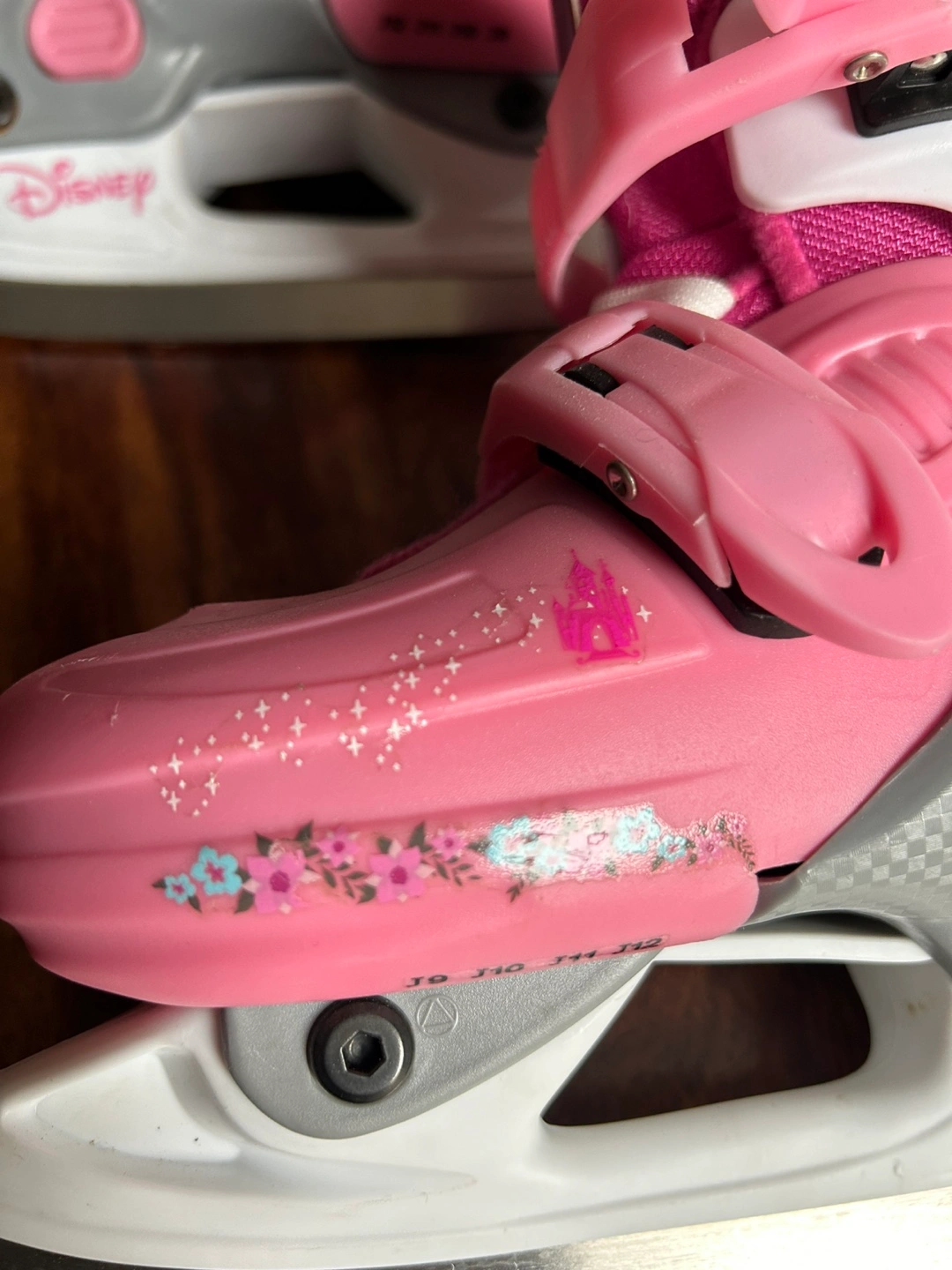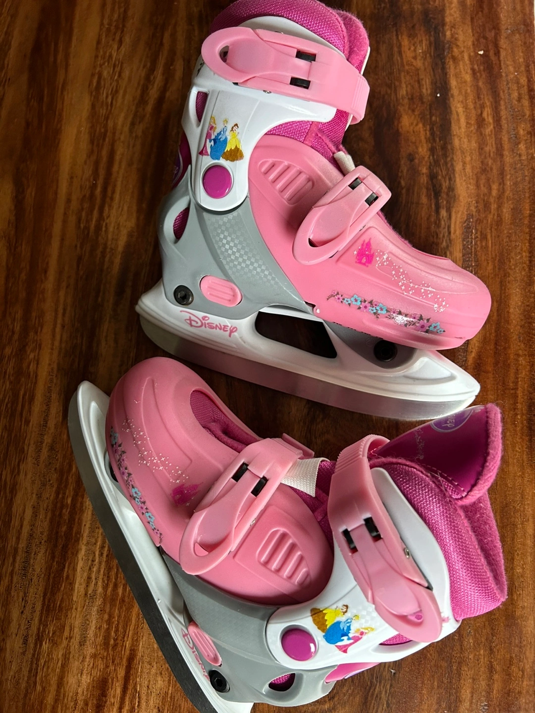 Selling a pair of adorable Disney Princess ice skates! They're pink and white, and feature favourite princesses like Cinderella and Aurora. The size is adjustable J9/10/11/12.