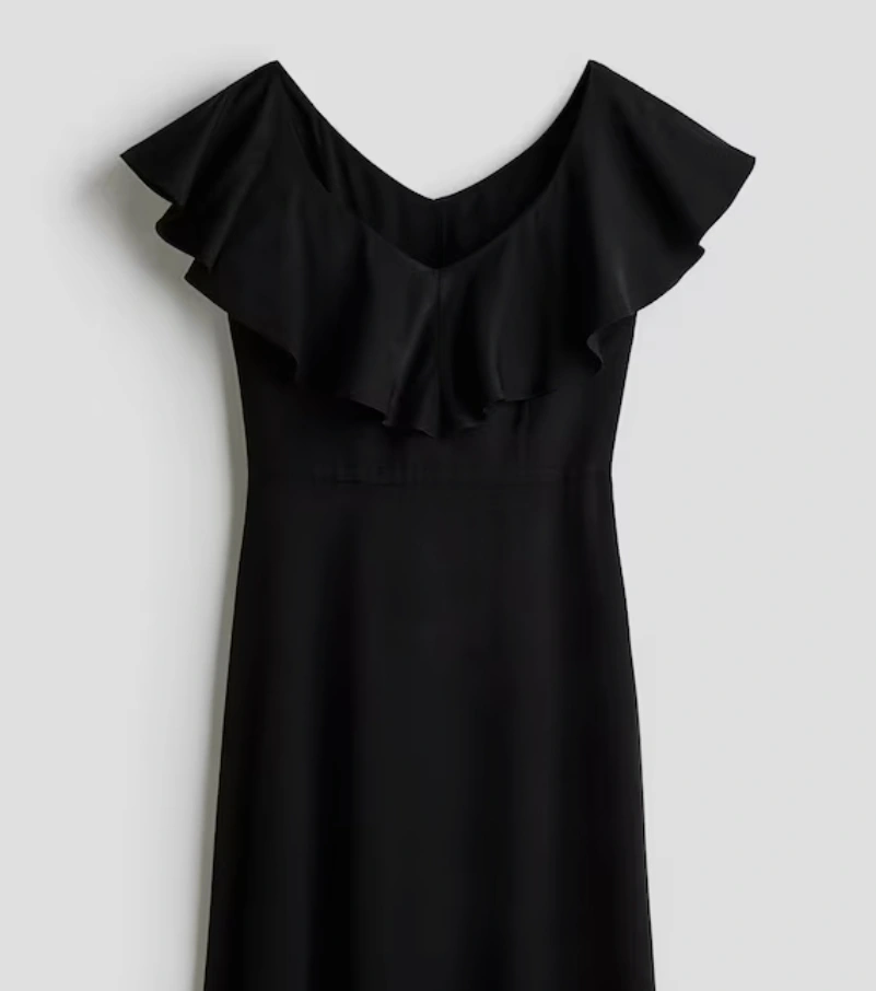 A stylish black dress with a ruffle detail. Perfect for a special occasion. It's in great condition and ready for a new hands!