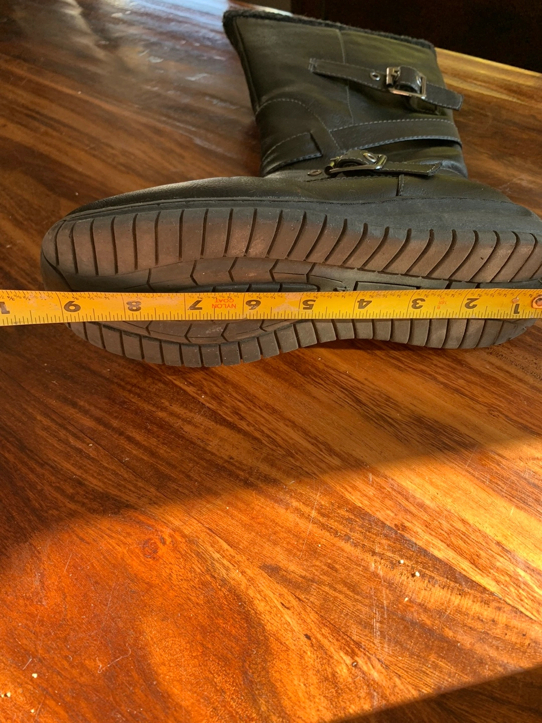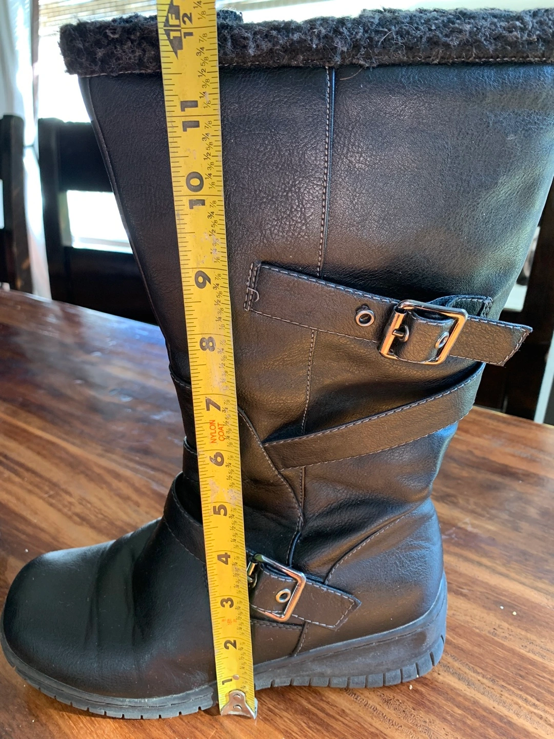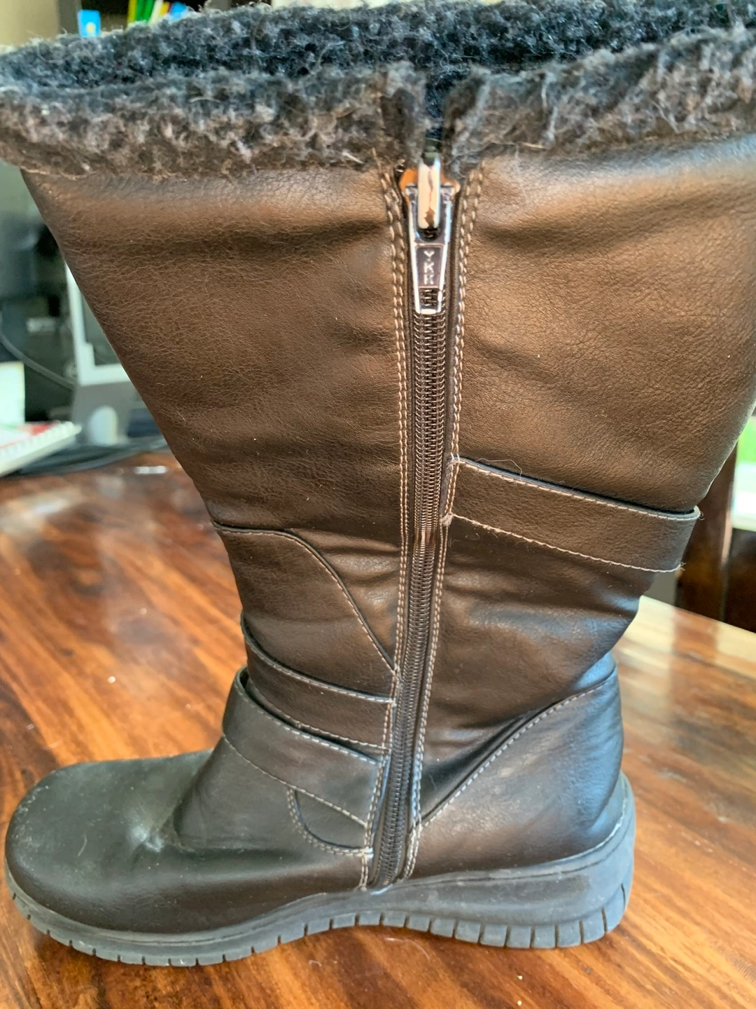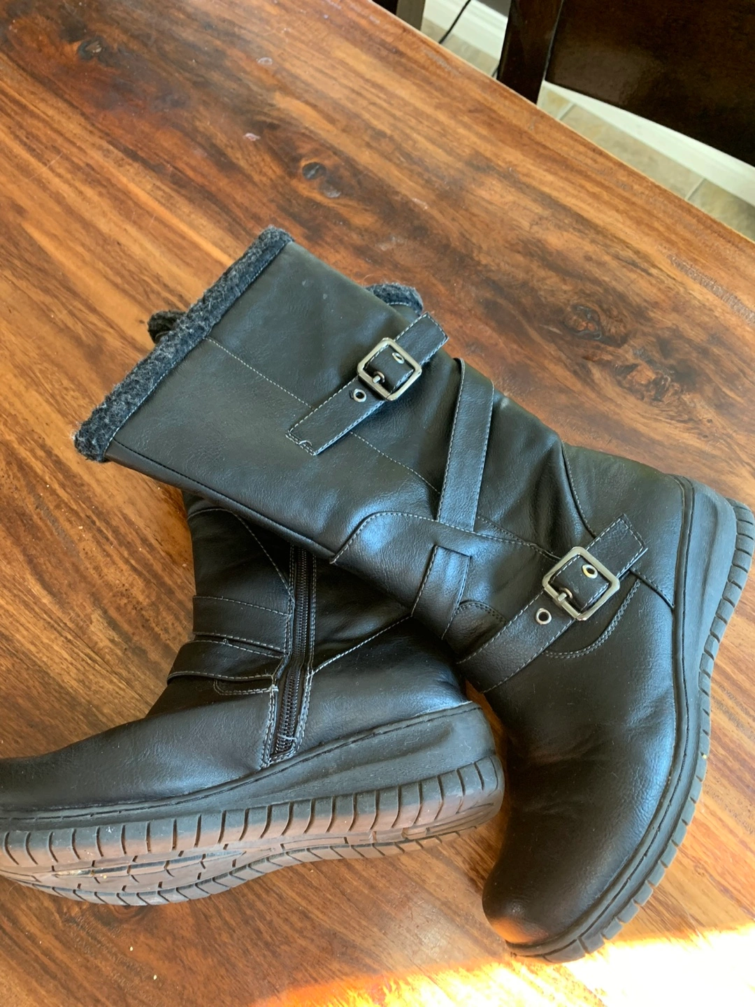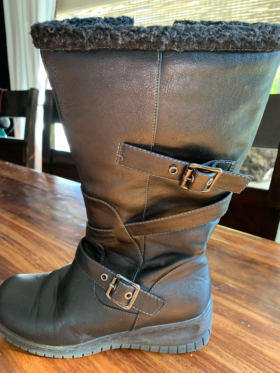 Selling a pair of black winter boots in size 4. They feature a faux fur trim and buckle detailing. Perfect for keeping your feet warm and stylish during the colder months!