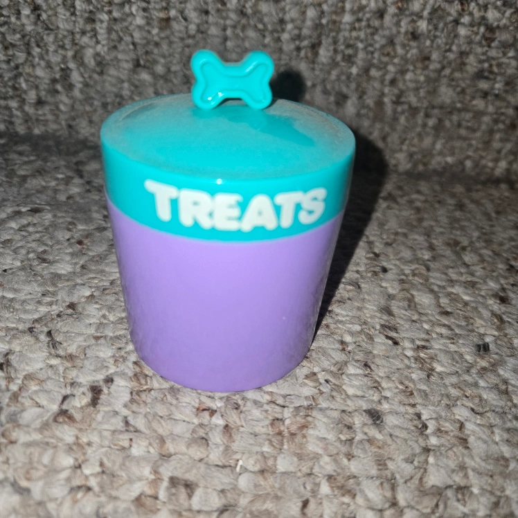 This is a purple and turquoise plastic treats container with a bone-shaped handle on the lid. The container has paw prints and bone designs around it. Perfect for storing your furry friend's favourite snacks on the kitchen counter or location of your choosing!