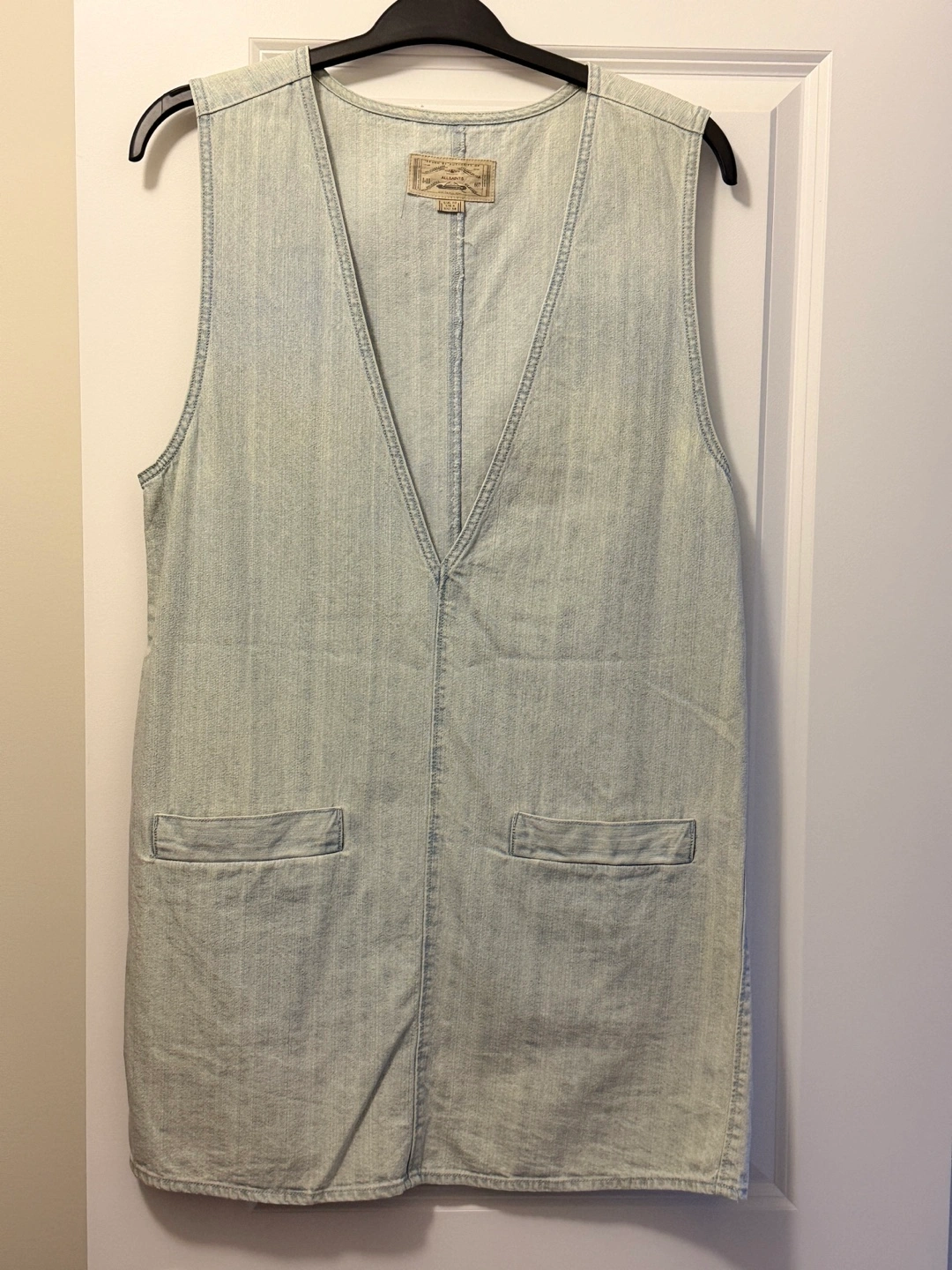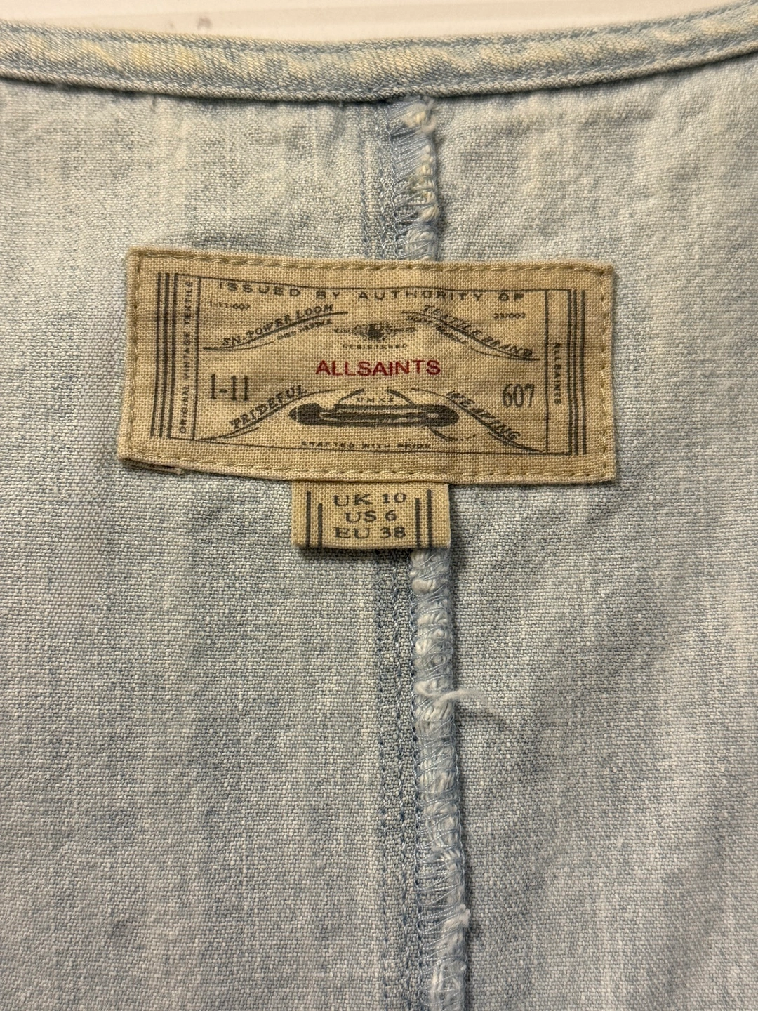 Selling an AllSaints denim dress in a light wash. It's a US size 6, which is a UK size 10. The dress has a V-neck and two front pockets. Perfect for a casual, stylish look!