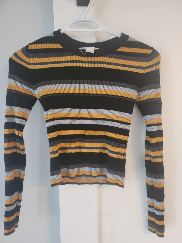 Cute H&M long-sleeve top with a striped pattern in black, grey, and yellow. It's a size small and in great condition! Perfect for layering or wearing on its own