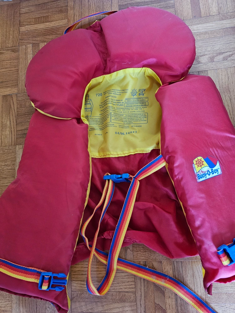 Selling a Buoy-O-Boy life jacket. It's in good condition and ready for some fun on the water! The jacket is red with yellow trim and has rainbow straps with blue buckles. Perfect for keeping your little one safe during water activities