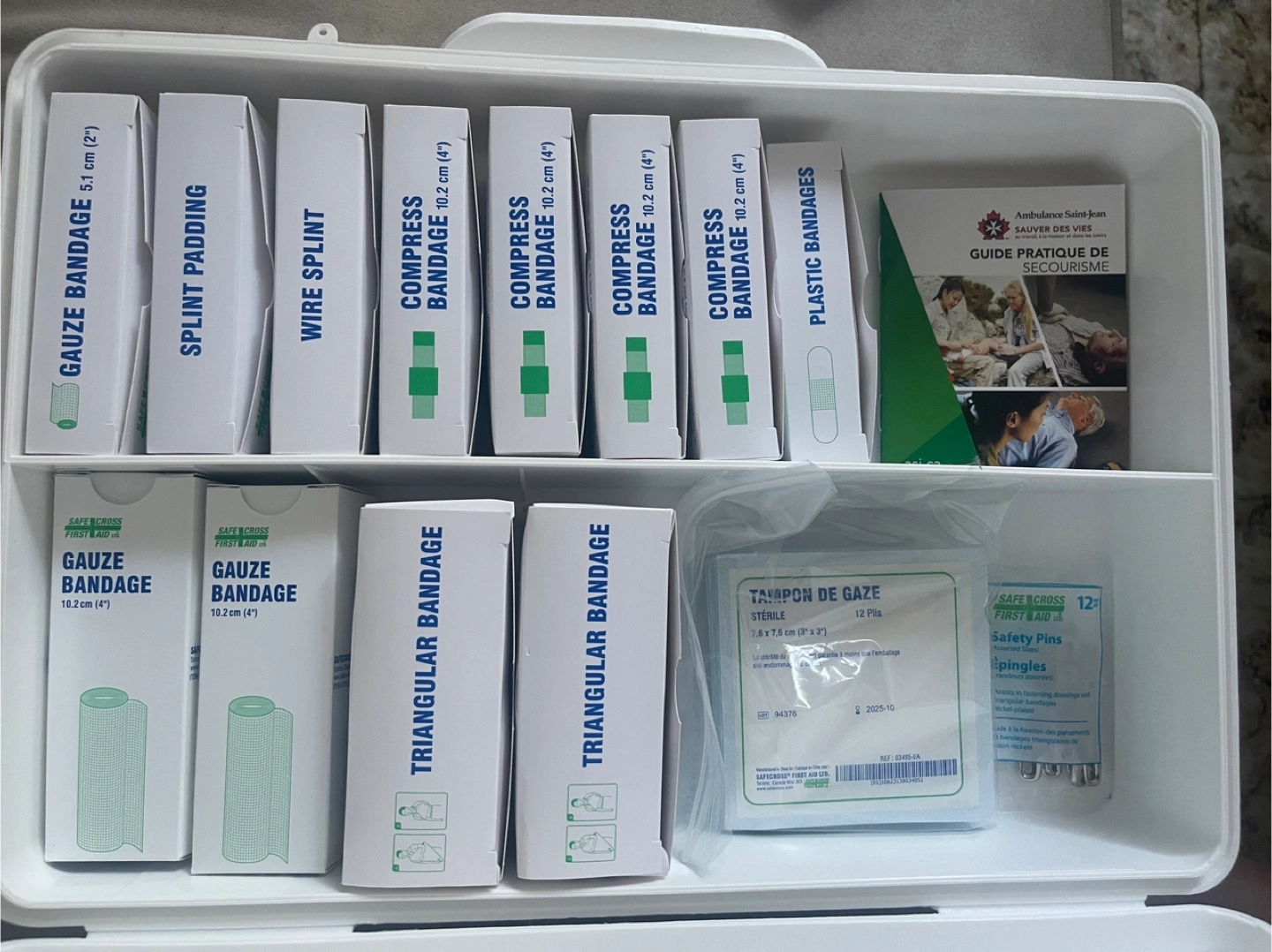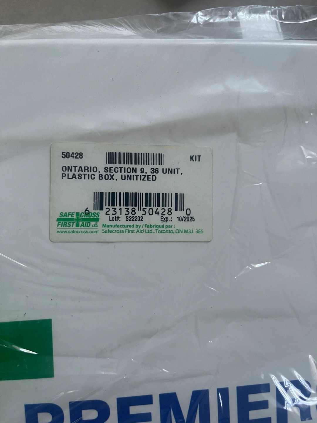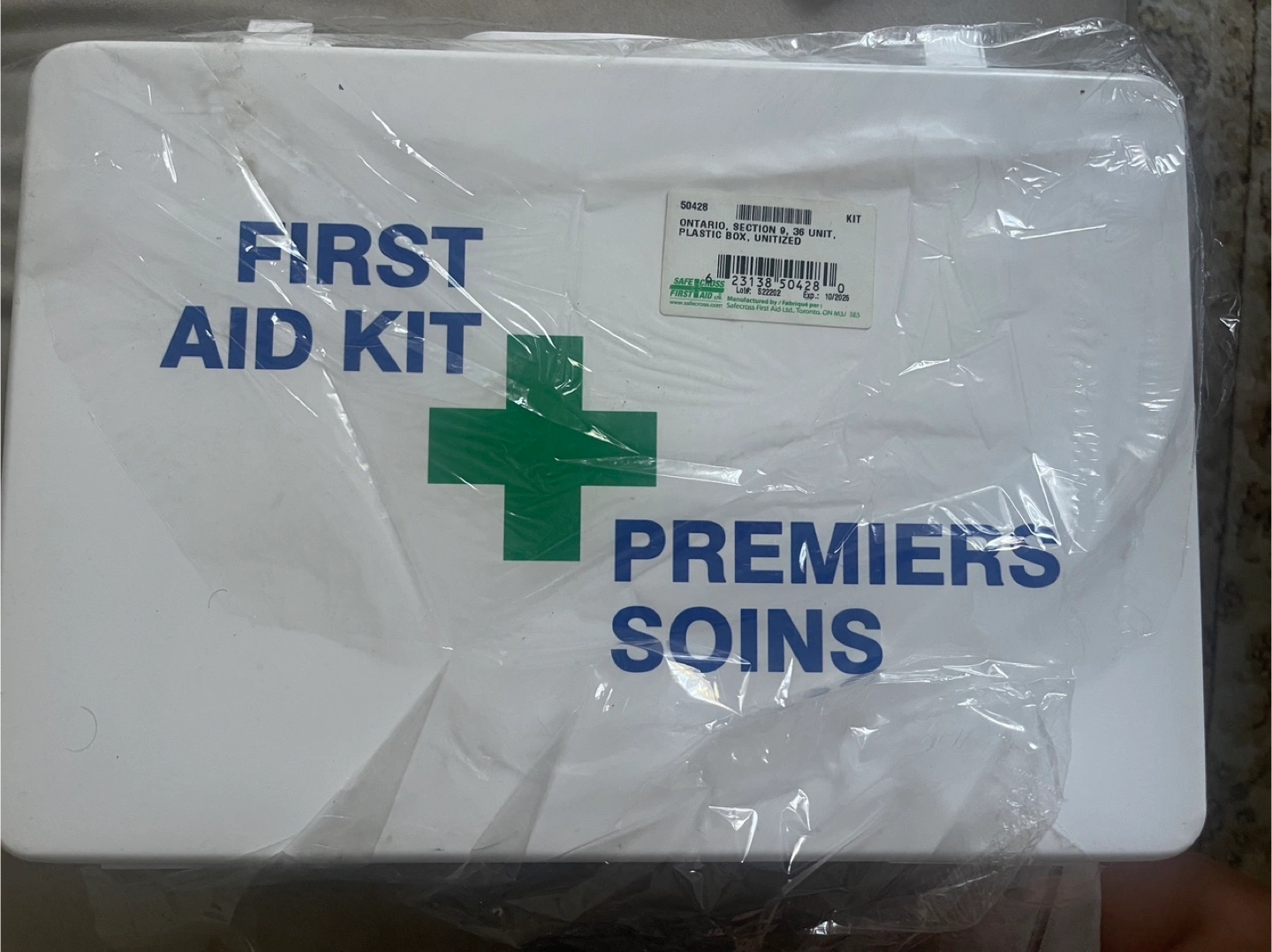 I'm selling a brand new Safe Cross First Aid Kit! This kit includes various bandages, gauze, padding, and safety pins. The expiration date is October 2026