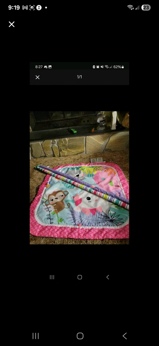 Selling a baby activity gym play mat. It features a colourful design with animals and includes the arches for hanging toys. Perfect for tummy time and early development!
