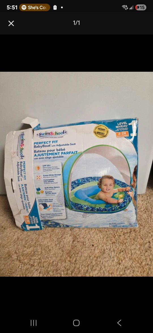 Selling a SwimSchool Perfect Fit BabyBoat with an adjustable seat! It's designed for babies aged 6-24 months. It has an extra-wide design and a soft play space for your little one. It also features UPF 50+ retractable canopy for sun protection