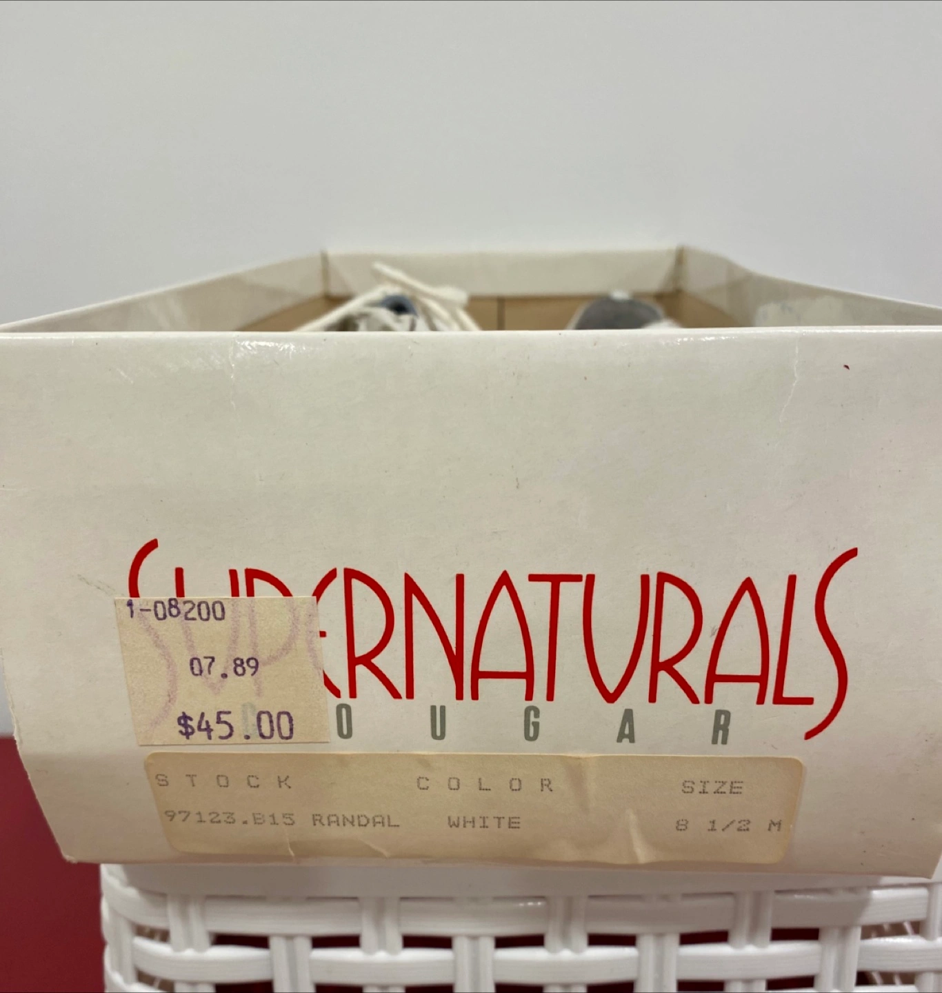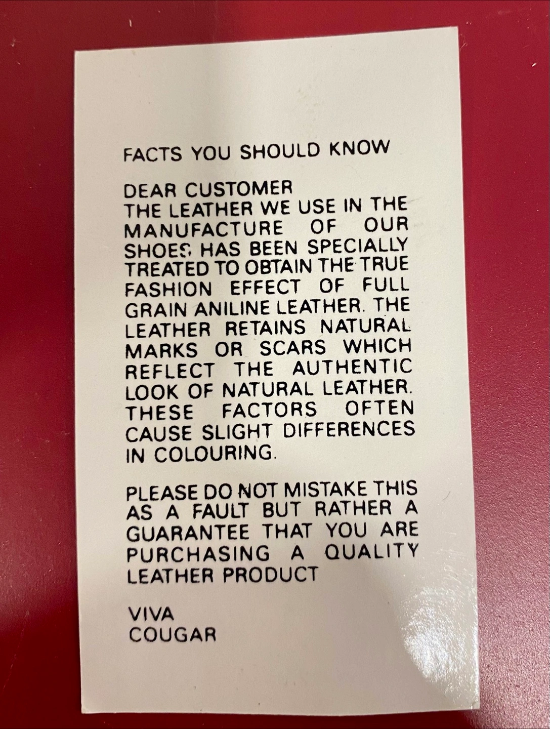 Vintage Leather Cougar Supernaturals Shoes Huarache Style Genuine Leather Sneaker-like soles New vintage/deadstock 1980s. While these are “new vintage”, they do have some flaws due to age. There is one small hole in the inner sole (see 4th photo), and some of the glue has yellowed due to age. Nevertheless these are gorgeous shoes. Comes with original box. Price is 1980s was $45. Size 8.5 Total length from tip to heel is 10.5”. Pick up in East York at O’Connor & Greenwood.