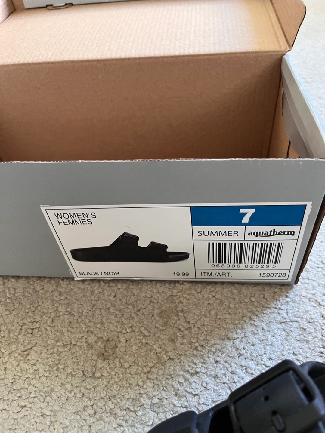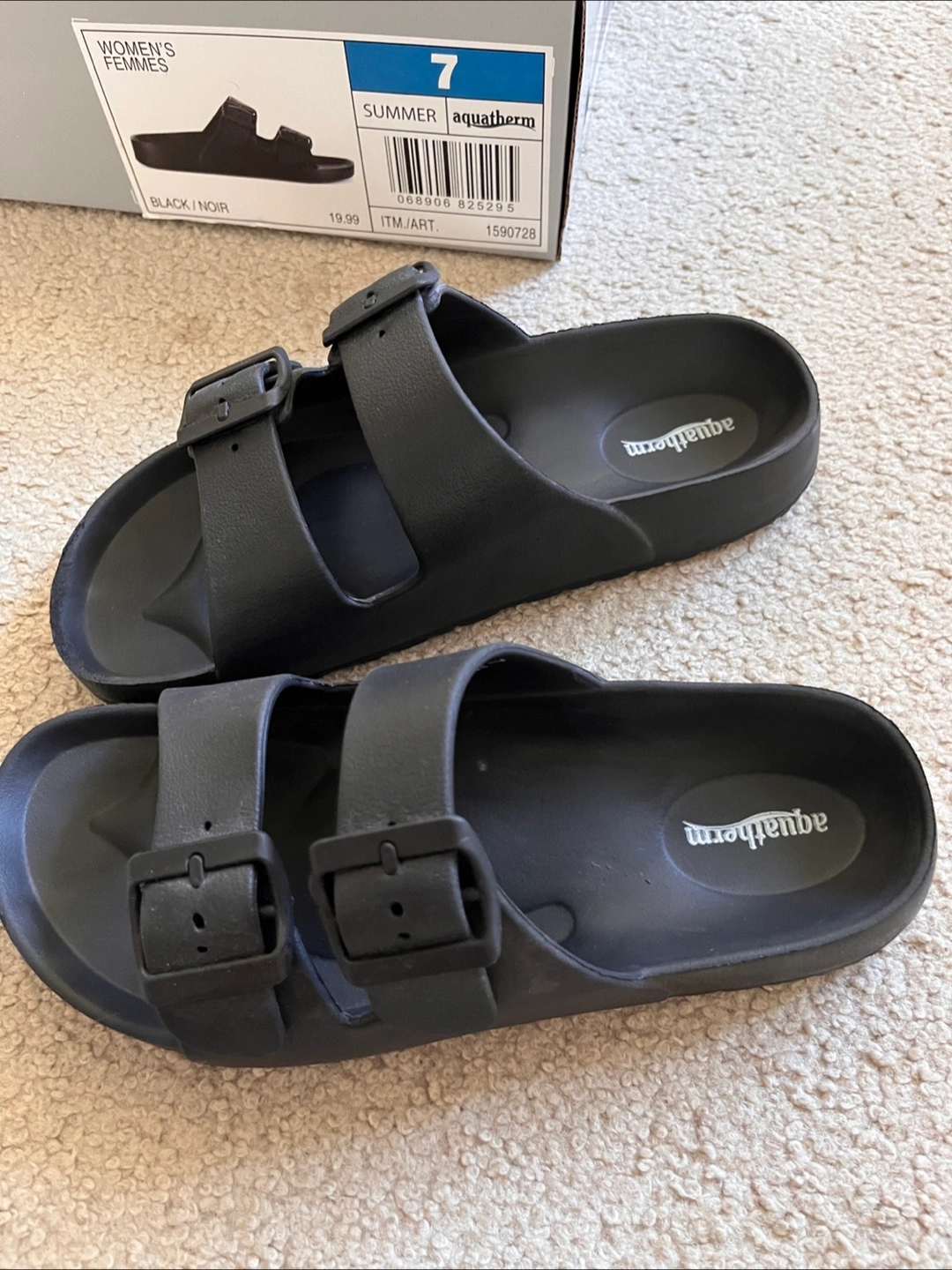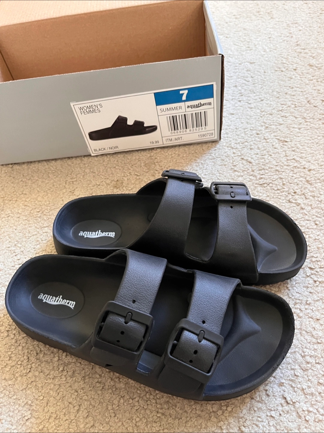 Selling a pair of Aquatherm Summer sandals in black. They are a size 7. The box is included. They are in good condition and ready for a new home!