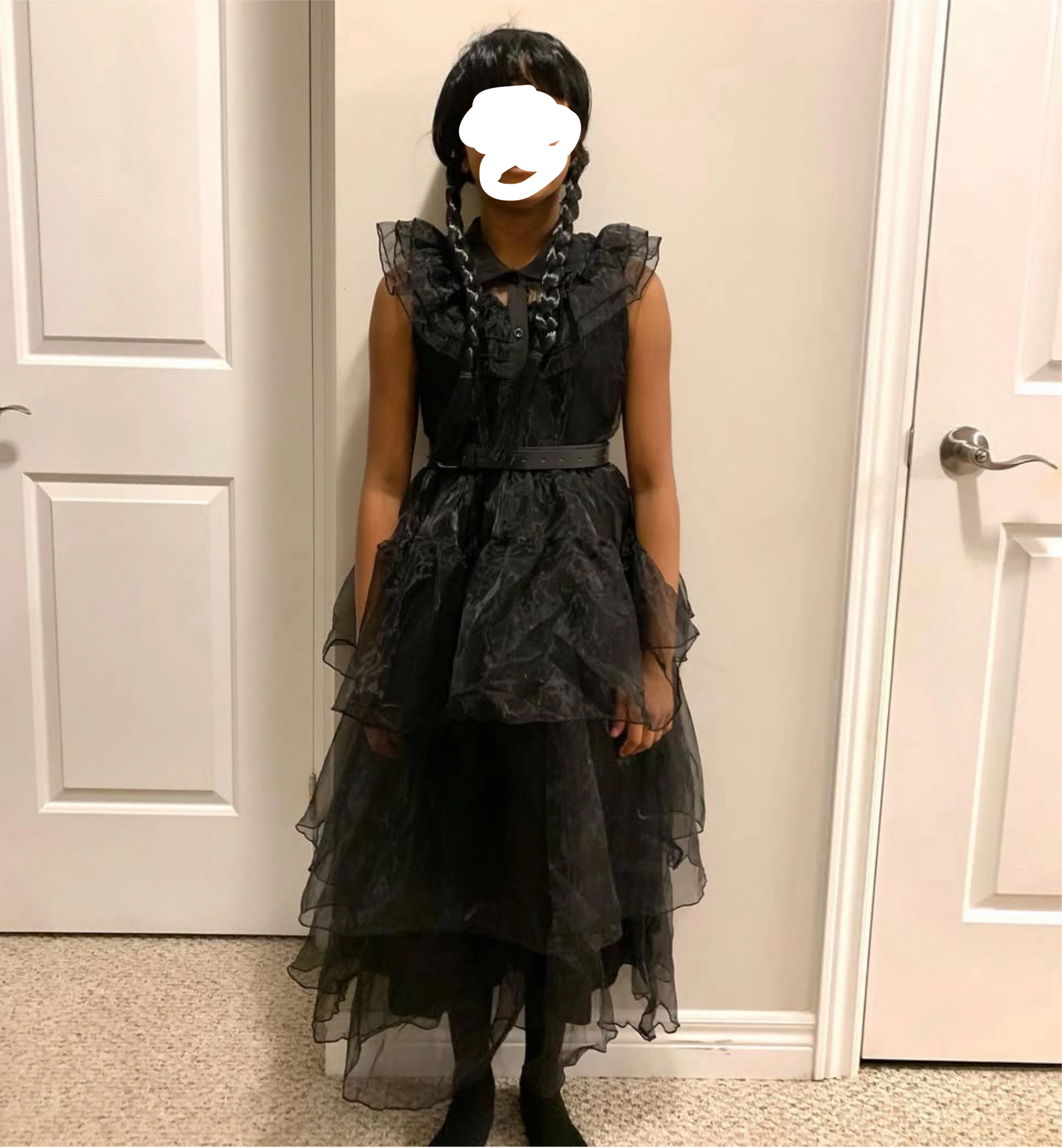 Selling a Wednesday Addams costume! It's black and features a tiered skirt and ruffled collar.