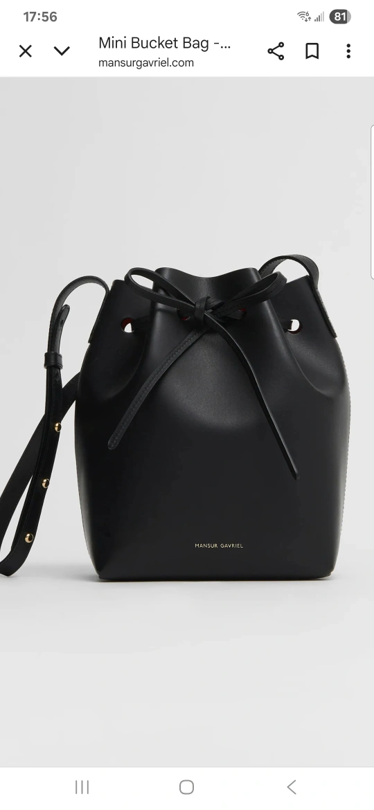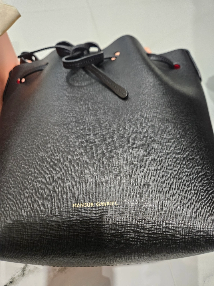 Selling a gently used Mansur Gavriel mini bucket bag in black! This stylish bag features a unique bucket design with a drawstring closure. The interior is a vibrant red, adding a pop of colour. Perfect for everyday use or a night out!