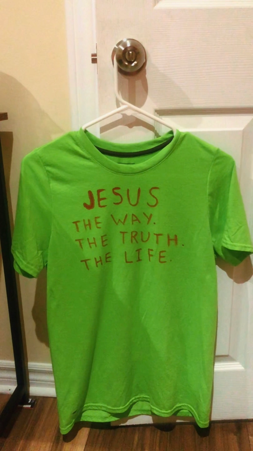 Selling a bright green t-shirt with the words "JESUS. THE WAY. THE TRUTH. THE LIFE." printed on the front. It's in good condition and ready for a new home!