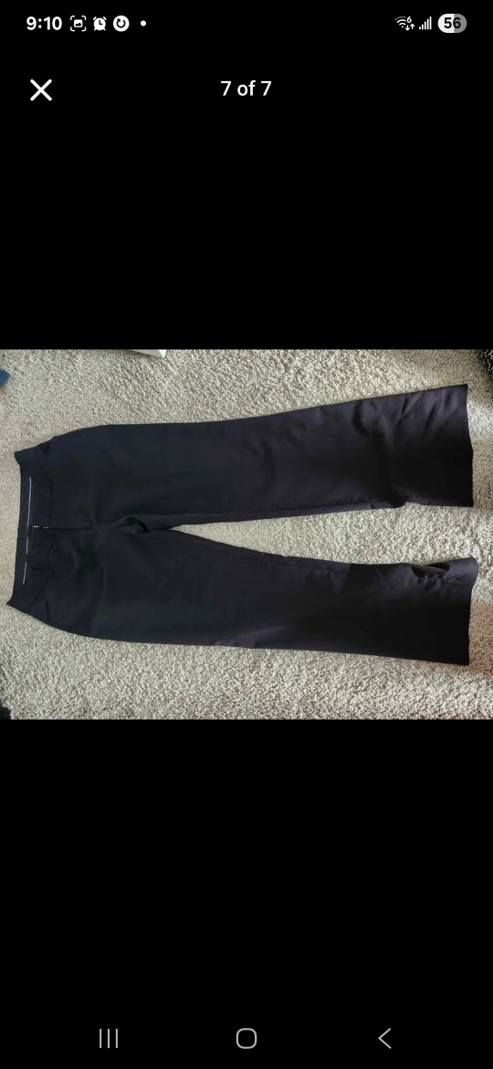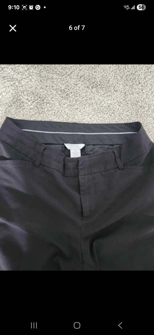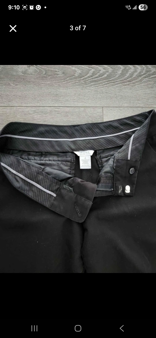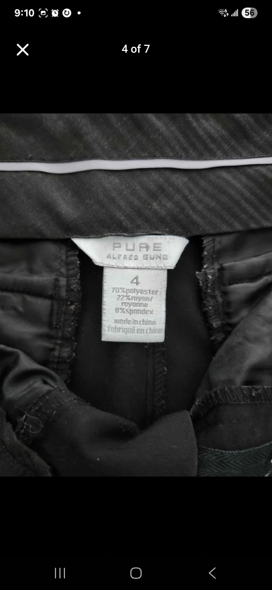 I'm selling a pair of Alfred Sung Pure black pants in size 4. They are made of 70% polyester, 22% rayon, and 8% spandex.