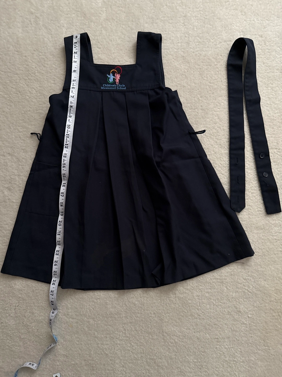 A Children's Circle Montessori School jumper/ tunic dress in great condition! It's a classic navy colour and comes with a tie. The length is approximately 27 inches. Perfect for school!