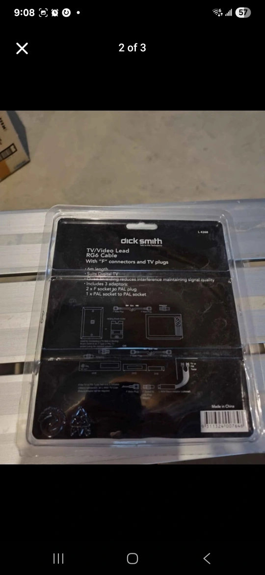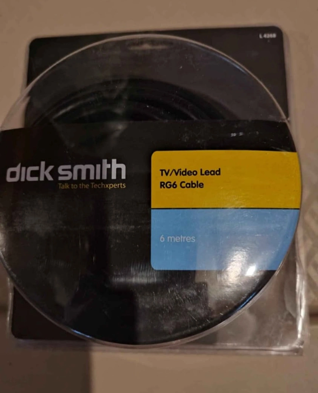 Selling a brand new Dick Smith TV/Video Lead RG6 Cable, still in its original packaging! It's 6 metres long and includes 3 adaptors. It also reduces interference, maintaining signal quality