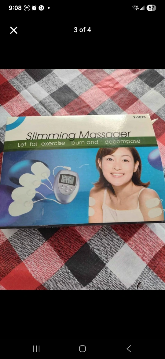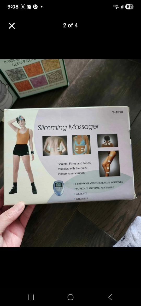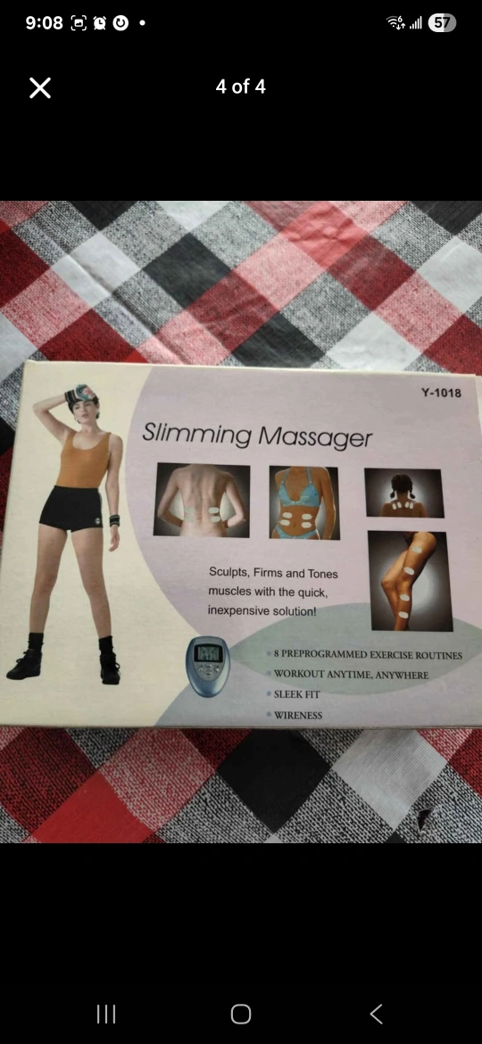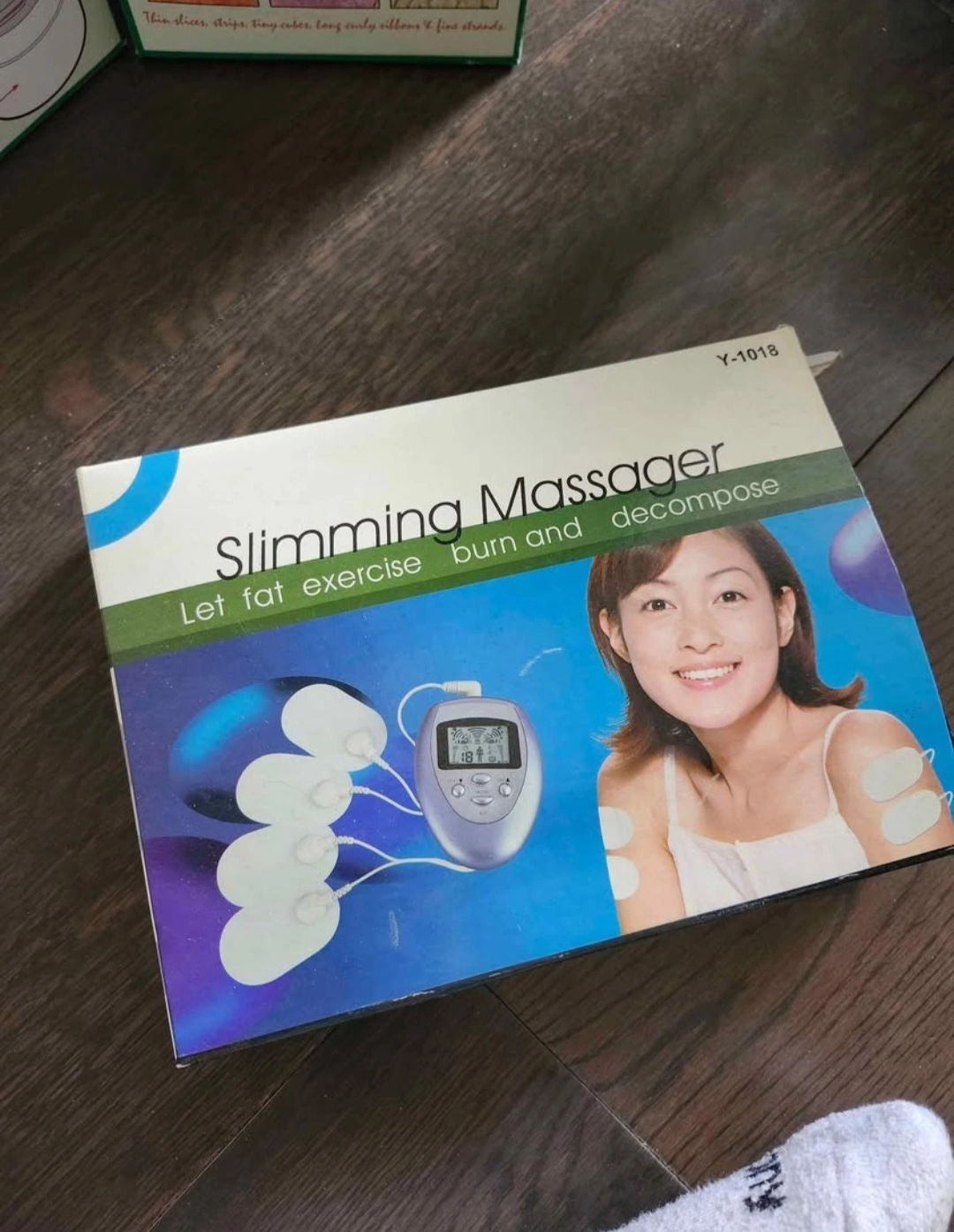 Selling a slimming massager, model Y-1018. This device is designed to sculpt, firm, and tone muscles with a quick and inexpensive solution. It features preprogrammed exercise routines and is sleek and wireless