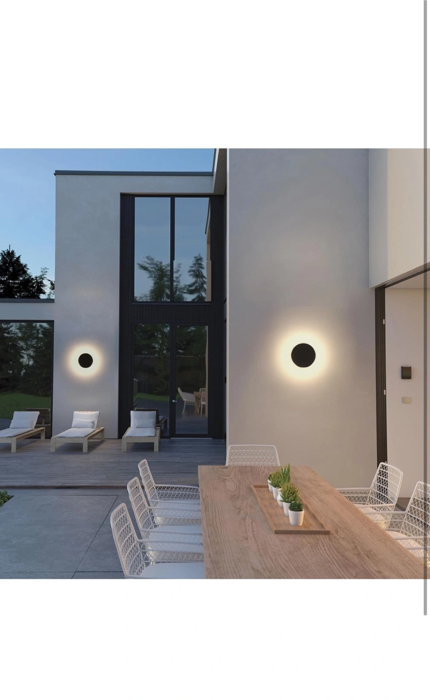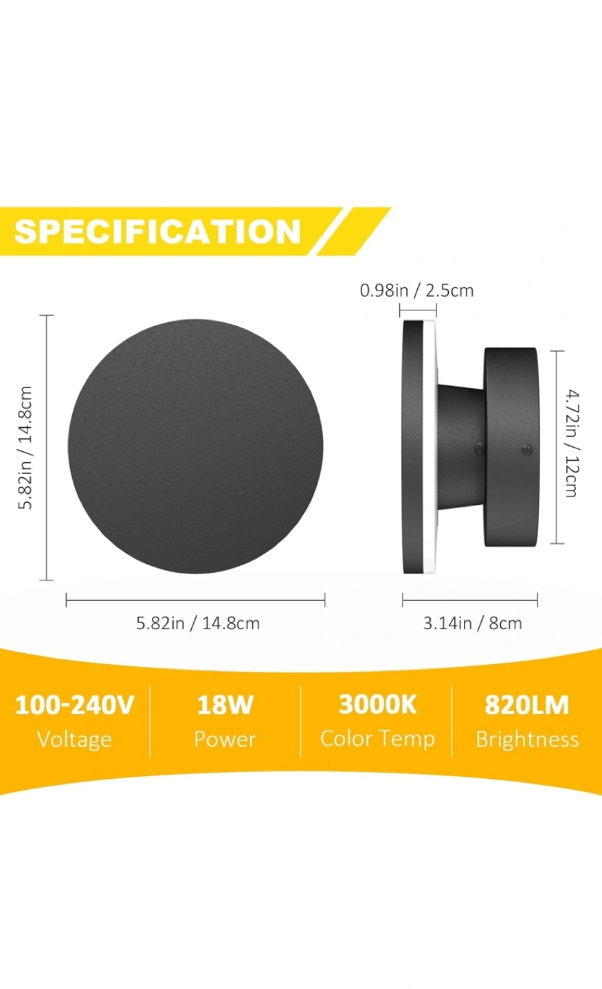 Selling an outdoor LED wall light fixture in black. It's anti-rust and made with high quality and durable materials. The dimensions are 5.82in / 14.8cm x 4.72in / 12cm. It uses 18W power and has a color temperature of 3000K with a brightness of 820LM