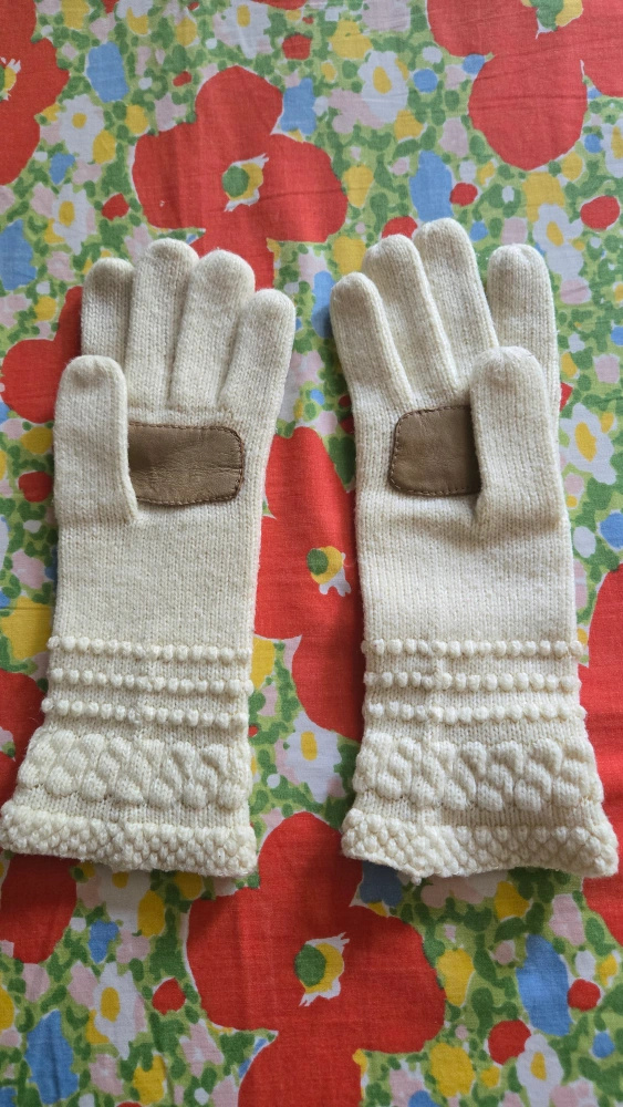 Selling a pair of cream-coloured knit gloves. These are in great condition and would be perfect for keeping your hands warm this winter. They feature a unique textured design on the cuffs and a leather patch on the back of the hand.