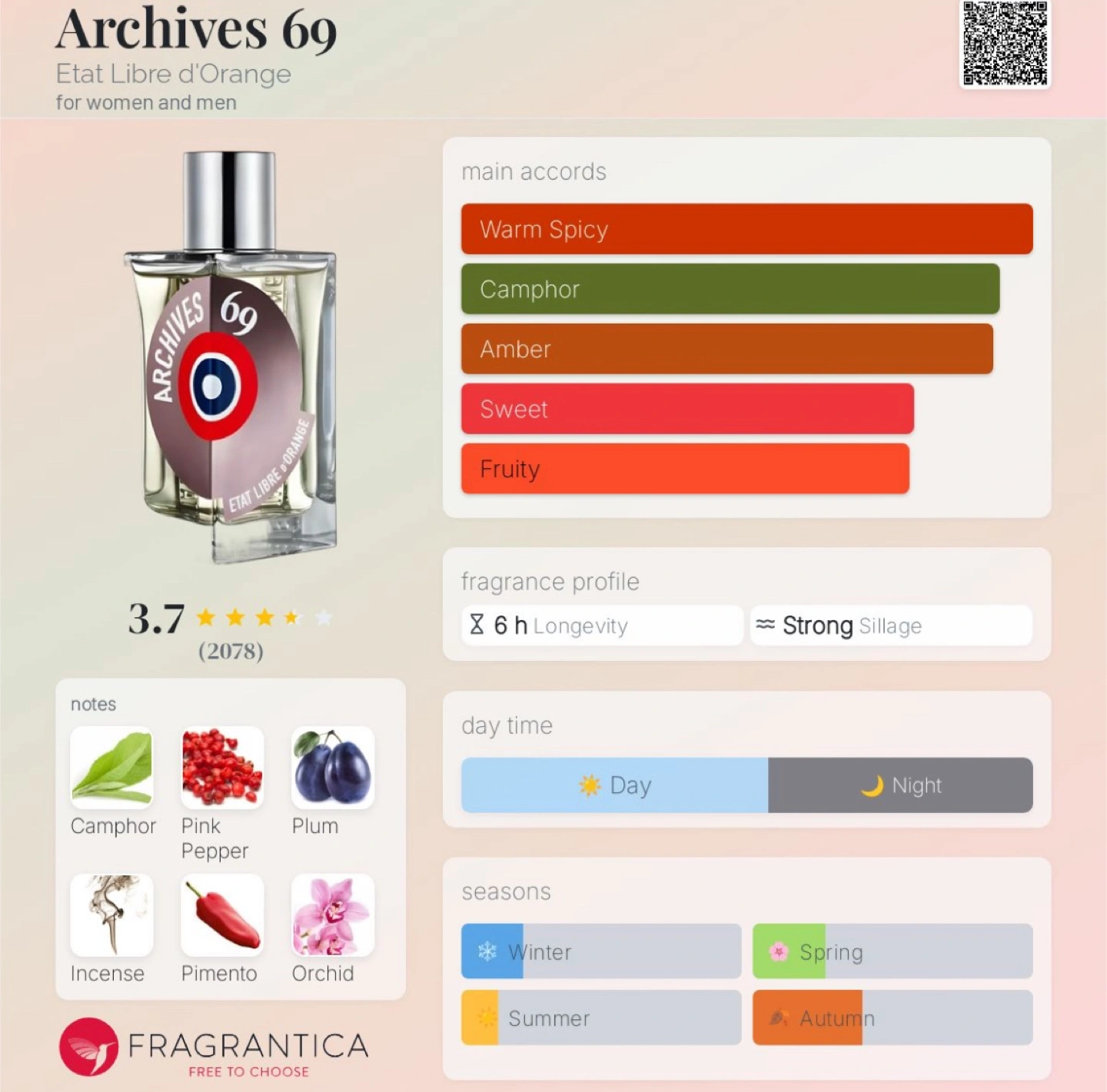 Selling a bottle of Etat Libre d'Orange Archives 69 Eau de Parfum 50ml. It comes with its original box. This fragrance has warm spicy, camphor, amber, sweet, and fruity notes. It's suitable for both day and night wear, and for spring and autumn seasons.